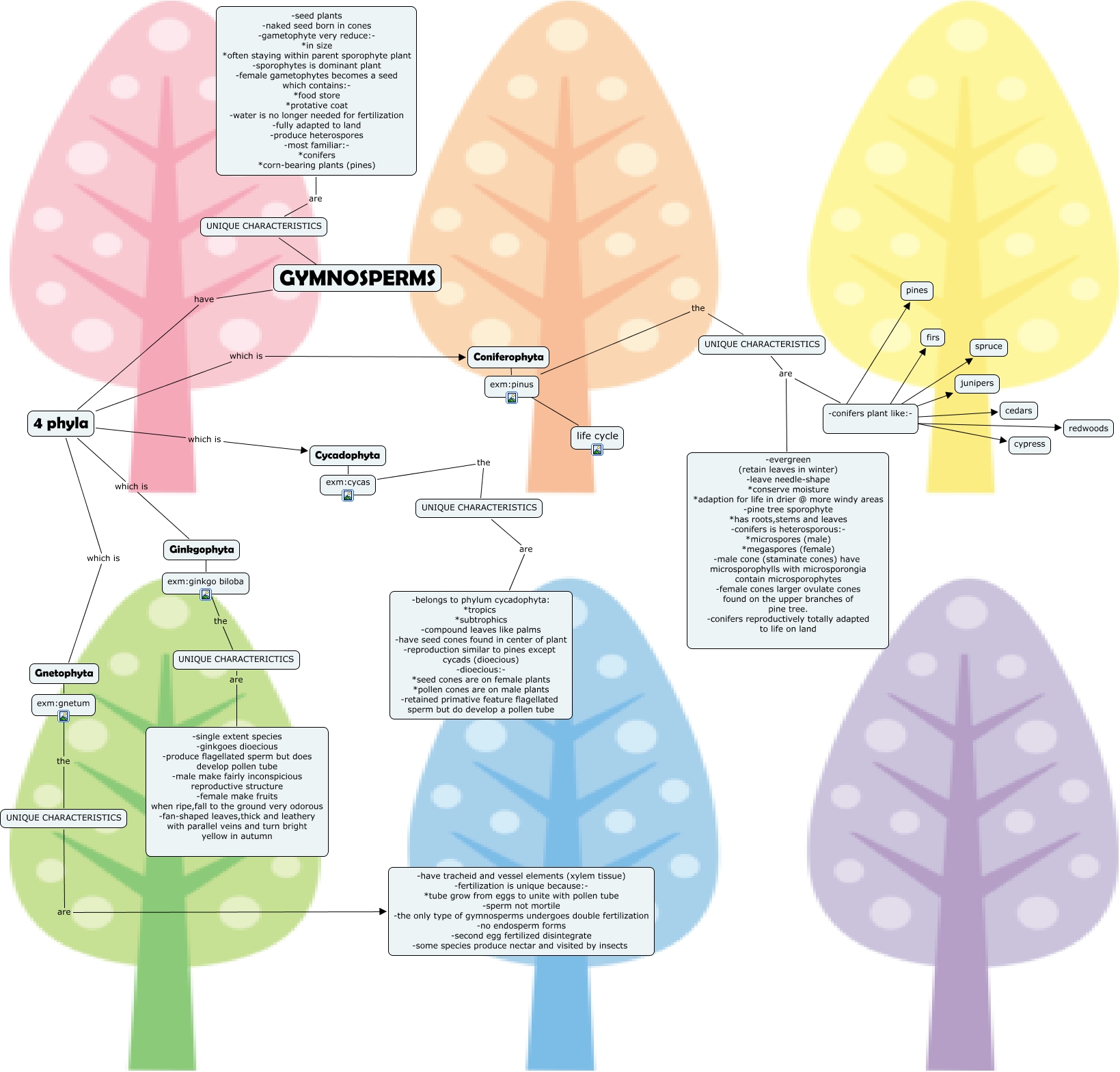 This Concept Map, created with IHMC CmapTools, has information related to: 11.5.3 gymnosperms -nuurlina, exm:ginkgo biloba ???? Ginkgophyta, exm:pinus ???? Coniferophyta, -conifers plant like:- ???? pines, UNIQUE CHARACTERISTICS are -evergreen (retain leaves in winter) -leave needle-shape *conserve moisture *adaption for life in drier @ more windy areas -pine tree sporophyte *has roots,stems and leaves -conifers is heterosporous:- *microspores (male) *megaspores (female) -male cone (staminate cones) have microsporophylls with microsporongia contain microsporophytes -female cones larger ovulate cones found on the upper branches of pine tree. -conifers reproductively totally adapted to life on land, -conifers plant like:- ???? firs, 4 phyla which is Cycadophyta, exm:pinus ???? life cycle, exm:cycas the UNIQUE CHARACTERISTICS, -conifers plant like:- ???? junipers, -conifers plant like:- ???? cypress, exm:pinus the UNIQUE CHARACTERISTICS, UNIQUE CHARACTERISTICS ???? GYMNOSPERMS, 4 phyla which is Coniferophyta, exm:cycas ???? Cycadophyta, -conifers plant like:- ???? spruce, -conifers plant like:- ???? cedars, UNIQUE CHARACTERISTICS are -have tracheid and vessel elements (xylem tissue) -fertilization is unique because:- *tube grow from eggs to unite with pollen tube -sperm not mortile -the only type of gymnosperms undergoes double fertilization -no endosperm forms -second egg fertilized disintegrate -some species produce nectar and visited by insects, GYMNOSPERMS have 4 phyla, -conifers plant like:- ???? redwoods, 4 phyla which is Ginkgophyta