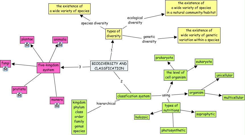 This Concept Map, created with IHMC CmapTools, has information related to: 11.1biodiversity and classfication_haziah, BIODIVERSITY AND CLASSFICATION 2 classfication system, five-kingdom system ???? monera, types of diversity genetic diversity the existence of wide variety of genetic variation within a species, types of diversity ecological diversity the existence of a wide variety of species in a natural community/habitat, the level of cell organism ???? prokaryote, types of diversity species diversity the existence of a wide variety of species, organism ???? unicellular, BIODIVERSITY AND CLASSFICATION 3 five-kingdom system, classfication system hierarchical kingdom phylum class order family genus species, five-kingdom system ???? plantae, five-kingdom system ???? fungi, types of nutritions ???? holozoic, organism ???? multicellular, classfication system using types of nutritions, types of nutritions ???? photosynthetic, classfication system using organism, five-kingdom system ???? animalia, types of nutritions ???? saprophytic, five-kingdom system ???? protista, BIODIVERSITY AND CLASSFICATION 1 types of diversity