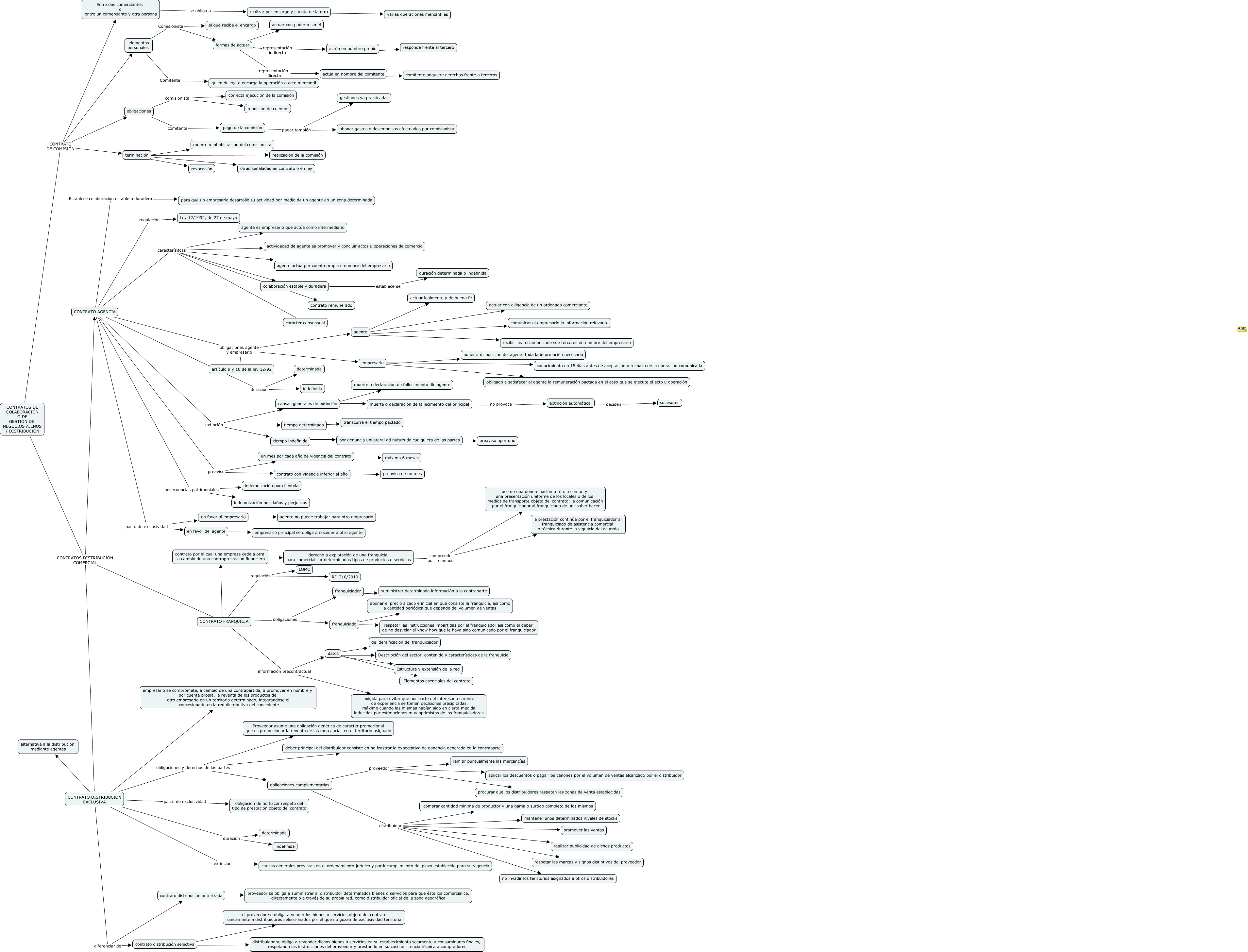 Aquest mapa conceptual conté informació relacionada amb: MERCA 3 ESCENARIO 3, un mes por cada año de vigencia del contrato ???? máximo 6 meses, franquiciado ???? respetar las instrucciones impartidas por el franquiciador así como el deber de no desvelar el know how que le haya sido comunicado por el franquiciador, actúa en nombre del comitente ???? comitente adquiere derechos frente a terceros, agente ???? comunicar al empresario la información relevante, franquiciado ???? abonar el precio alzado e inicial en qué consiste la franquicia, así como la cantidad periódica que depende del volumen de ventas., obligaciones comisionista rendición de cuentas, CONTRATO DISTRIBUCIÓN EXCLUSIVA diferenciar de contrato distribución selectiva, terminación ???? realización de la comisión, CONTRATO DISTRIBUCIÓN EXCLUSIVA duración indefinida, actúa en nombre propio ???? responde frente al tercero, CONTRATO AGENCIA consecuencias patrimoniales indemnización por daños y perjuicios, CONTRATO DISTRIBUCIÓN EXCLUSIVA extinción causas generales previstas en el ordenamiento jurídico y por incumplimiento del plazo establecido para su vigencia, CONTRATO DISTRIBUCIÓN EXCLUSIVA ???? alternativa a la distribución mediante agentes, CONTRATO AGENCIA caracterísitcas agente es empresario que actúa como intermediario, CONTRATO AGENCIA pacto de exclusividad en favor al empresario, agente ???? actuar con diligencia de un ordenado comerciante, CONTRATO AGENCIA obligaciones agente y empresario agente, elementos personales Comisionista formas de actuar, datos ???? Descripción del sector, contenido y características de la franquicia, CONTRATO DISTRIBUCIÓN EXCLUSIVA duración determinada