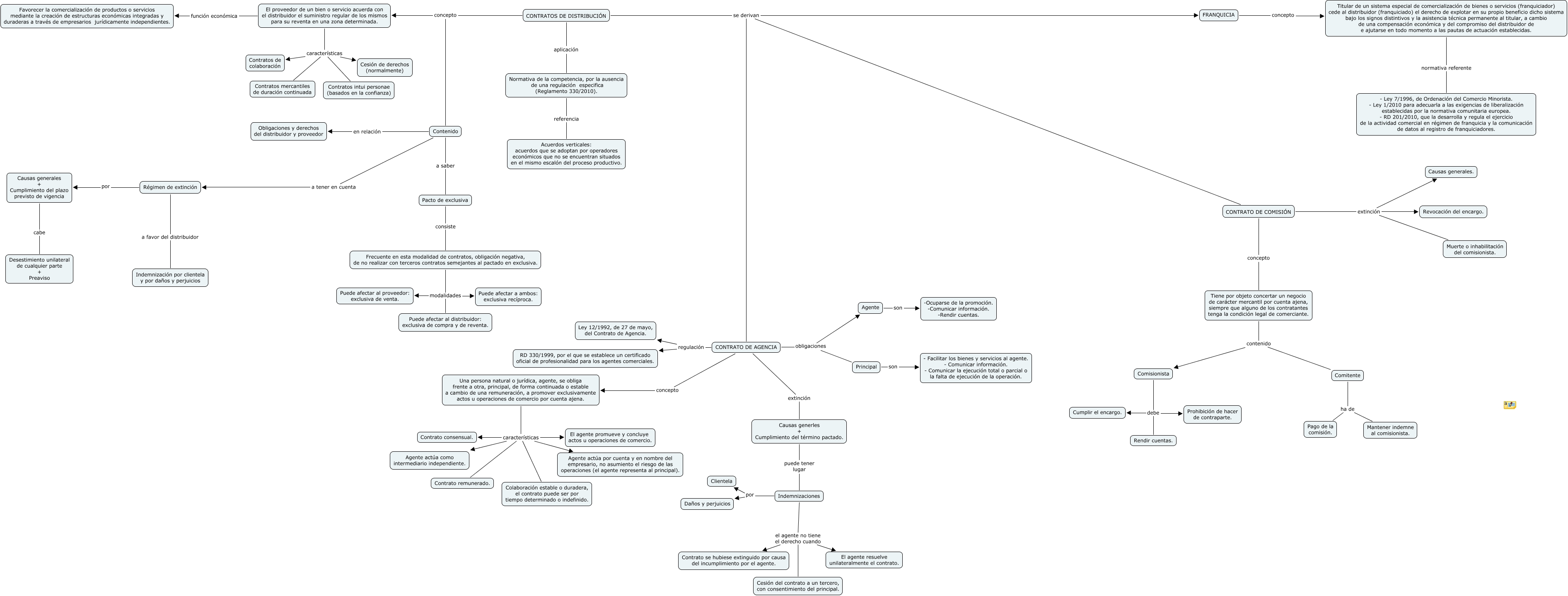 Aquest mapa conceptual conté informació relacionada amb: Esc 3 - Contratos distribución, El proveedor de un bien o servicio acuerda con el distribuidor el suministro regular de los mismos para su reventa en una zona determinada. características Contratos de colaboración, El proveedor de un bien o servicio acuerda con el distribuidor el suministro regular de los mismos para su reventa en una zona determinada. características Contratos intui personae (basados en la confianza), Indemnizaciones el agente no tiene el derecho cuando El agente resuelve unilateralmente el contrato., CONTRATO DE COMISIÓN extinción Causas generales., Comisionista debe Cumplir el encargo., Normativa de la competencia, por la ausencia de una regulación especifica (Reglamento 330/2010). referencia Acuerdos verticales: acuerdos que se adoptan por operadores económicos que no se encuentran situados en el mismo escalón del proceso productivo., Contenido a saber Pacto de exclusiva, Frecuente en esta modalidad de contratos, obligación negativa, de no realizar con terceros contratos semejantes al pactado en exclusiva. modalidades Puede afectar al proveedor: exclusiva de venta., Contenido a tener en cuenta Régimen de extinción, Comisionista debe Prohibición de hacer de contraparte., Una persona natural o jurídica, agente, se obliga frente a otra, principal, de forma continuada o estable a cambio de una remuneración, a promover exclusivamente actos u operaciones de comercio por cuenta ajena. características Contrato consensual., CONTRATO DE AGENCIA concepto Una persona natural o jurídica, agente, se obliga frente a otra, principal, de forma continuada o estable a cambio de una remuneración, a promover exclusivamente actos u operaciones de comercio por cuenta ajena., El proveedor de un bien o servicio acuerda con el distribuidor el suministro regular de los mismos para su reventa en una zona determinada. características Cesión de derechos (normalmente), CONTRATO DE AGENCIA obligaciones Agente, CONTRATOS DE DISTRIBUCIÓN concepto El proveedor de un bien o servicio acuerda con el distribuidor el suministro regular de los mismos para su reventa en una zona determinada., Comitente ha de Mantener indemne al comisionista., CONTRATO DE COMISIÓN extinción Revocación del encargo., Frecuente en esta modalidad de contratos, obligación negativa, de no realizar con terceros contratos semejantes al pactado en exclusiva. modalidades Puede afectar al distribuidor: exclusiva de compra y de reventa., Pacto de exclusiva consiste Frecuente en esta modalidad de contratos, obligación negativa, de no realizar con terceros contratos semejantes al pactado en exclusiva., Tiene por objeto concertar un negocio de carácter mercantil por cuenta ajena, siempre que alguno de los contratantes tenga la condición legal de comerciante. contenido Comisionista