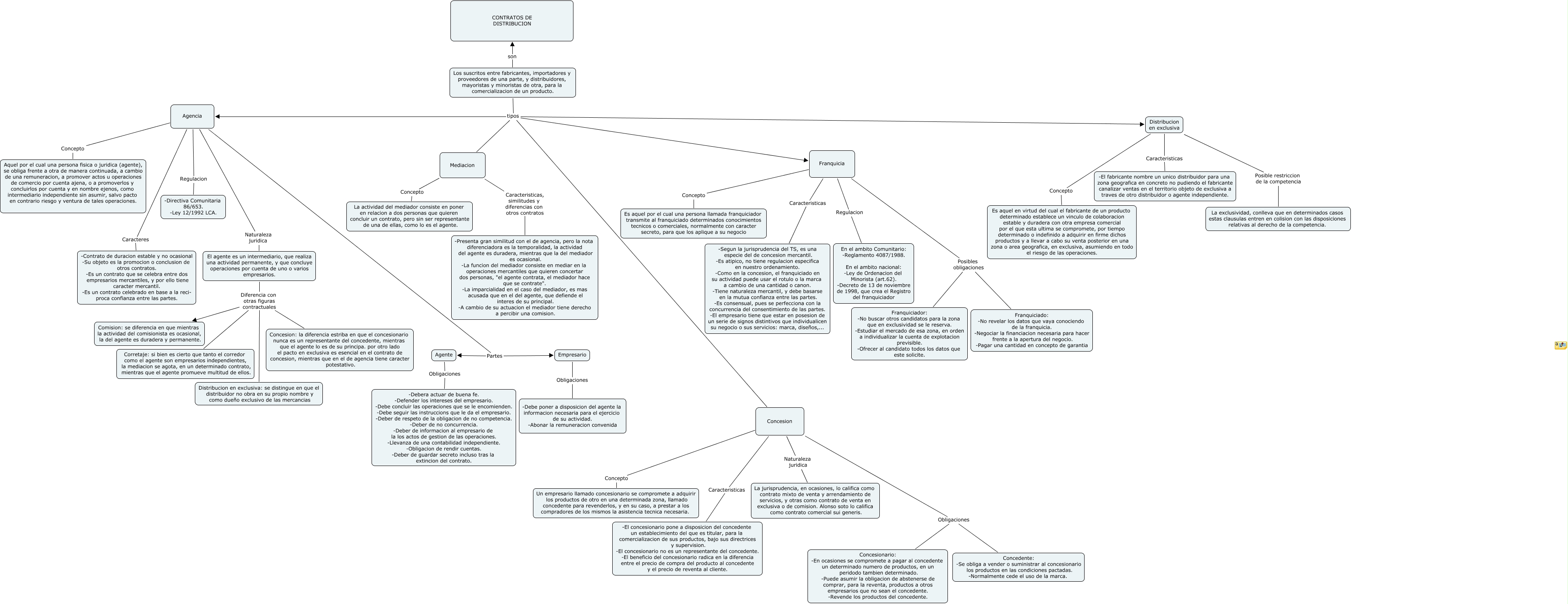 Aquest mapa conceptual conté informació relacionada amb: Mapa III C. Distribucion, Los suscritos entre fabricantes, importadores y proveedores de una parte, y distribuidores, mayoristas y minoristas de otra, para la comercializacion de un producto. tipos Franquicia, Franquicia Posibles obligaciones Franquiciador: -No buscar otros candidatos para la zona que en exclusividad se le reserva. -Estudiar el mercado de esa zona, en orden a individualizar la cuenta de explotacion previsible. -Ofrecer al candidato todos los datos que este solicite., Agencia Partes Agente, Mediacion Concepto La actividad del mediador consiste en poner en relacion a dos personas que quieren concluir un contrato, pero sin ser representante de una de ellas, como lo es el agente., Los suscritos entre fabricantes, importadores y proveedores de una parte, y distribuidores, mayoristas y minoristas de otra, para la comercializacion de un producto. tipos Mediacion, Franquicia Concepto Es aquel por el cual una persona llamada franquiciador transmite al franquiciado determinados conocimientos tecnicos o comerciales, normalmente con caracter secreto, para que los aplique a su negocio, Agente Obligaciones -Debera actuar de buena fe. -Defender los intereses del empresario. -Debe concluir las operaciones que se le encomienden. -Debe seguir las instruccions que le da el empresario. -Deber de respeto de la obligacion de no competencia. -Deber de no concurrencia. -Deber de informacion al empresario de la los actos de gestion de las operaciones. -Llevanza de una contabilidad independiente. -Obligacion de rendir cuentas. -Deber de guardar secreto incluso tras la extincion del contrato., El agente es un intermediario, que realiza una actividad permanente, y que concluye operaciones por cuenta de uno o varios empresarios. Diferencia con otras figuras contractuales Corretaje: si bien es cierto que tanto el corredor como el agente son empresarios independientes, la mediacion se agota, en un determinado contrato, mientras que el agente promueve multitud de ellos., Distribucion en exclusiva Caracteristicas -El fabricante nombre un unico distribuidor para una zona geografica en concreto no pudiendo el fabricante canalizar ventas en el territorio objeto de exclusiva a traves de otro distribuidor o agente independiente., Agencia Concepto Aquel por el cual una persona fisica o juridica (agente), se obliga frente a otra de manera continuada, a cambio de una remuneracion, a promover actos u operaciones de comercio por cuenta ajena, o a promoverlos y concluirlos por cuenta y en nombre ejenos, como intermediario independiente sin asumir, salvo pacto en contrario riesgo y ventura de tales operaciones., Agencia Partes Empresario, Franquicia Caracteristicas -Segun la jurisprudencia del TS, es una especie del de concesion mercantil. -Es atipico, no tiene regulacion especifica en nuestro ordenamiento. -Como en la concesion, el franquiciado en su actividad puede usar el rotulo o la marca a cambio de una cantidad o canon. -Tiene naturaleza mercantil, y debe basarse en la mutua confianza entre las partes. -Es consensual, pues se perfecciona con la concurrencia del consentimiento de las partes. -El empresario tiene que estar en posesion de un serie de signos distintivos que individualicen su negocio o sus servicios: marca, diseños,..., Los suscritos entre fabricantes, importadores y proveedores de una parte, y distribuidores, mayoristas y minoristas de otra, para la comercializacion de un producto. tipos Concesion, Distribucion en exclusiva Concepto Es aquel en virtud del cual el fabricante de un producto determinado establece un vinculo de colaboracion estable y duradera con otra empresa comercial por el que esta ultima se compromete, por tiempo determinado o indefinido a adquirir en firme dichos productos y a llevar a cabo su venta posterior en una zona o area geografica, en exclusiva, asumiendo en todo el riesgo de las operaciones., Distribucion en exclusiva Posible restriccion de la competencia La exclusividad, conlleva que en determinados casos estas clausulas entren en colision con las disposiciones relativas al derecho de la competencia., Concesion Concepto Un empresario llamado concesionario se compromete a adquirir los productos de otro en una determinada zona, llamado concedente para revenderlos, y en su caso, a prestar a los compradores de los mismos la asistencia tecnica necesaria., Los suscritos entre fabricantes, importadores y proveedores de una parte, y distribuidores, mayoristas y minoristas de otra, para la comercializacion de un producto. tipos Distribucion en exclusiva, Concesion Obligaciones Concedente: -Se obliga a vender o suministrar al concesionario los productos en las condiciones pactadas. -Normalmente cede el uso de la marca., Franquicia Posibles obligaciones Franquiciado: -No revelar los datos que vaya conociendo de la franquicia. -Negociar la financiacion necesaria para hacer frente a la apertura del negocio. -Pagar una cantidad en concepto de garantia, Agencia Caracteres -Contrato de duracion estable y no ocasional -Su objeto es la promocion o conclusion de otros contratos. -Es un contrato que se celebra entre dos empresarios mercantiles, y por ello tiene caracter mercantil. -Es un contrato celebrado en base a la reci- proca confianza entre las partes.