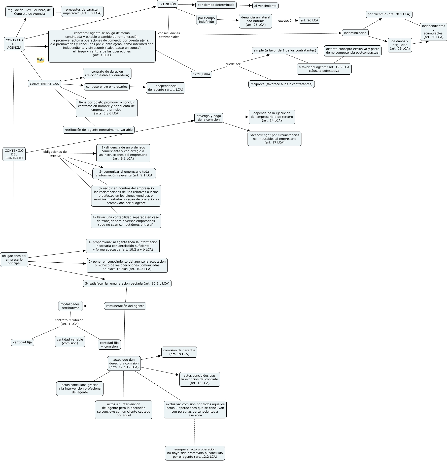Este Cmap, tiene información relacionada con: escenario 3 cto agencia, actos que dan derecho a comisión (arts. 12 a 17 LCA) ???? actos sin intervención del agente pero la operación se concluye con un cliente captado por aquél, remuneración del agente ???? actos que dan derecho a comisión (arts. 12 a 17 LCA), obligaciones del empresario principal ???? 1- proporcionar al agente toda la información necesaria con antelación suficiente y forma adecuada (art. 10.2 a y b LCA), CONTENIDO DEL CONTRATO obligaciones del agente 4- llevar una contabilidad separada en caso de trabajar para diversos empresarios (que no sean competidores entre sí), regulación: Ley 12/1992, del Contrato de Agencia ???? preceptos de carácter imperativo (art. 3.2 LCA), EXTINCIÓN consecuencias patrimoniales indeminización, CONTENIDO DEL CONTRATO ???? obligaciones del empresario principal, EXTINCIÓN ???? por tiempo indefinido, concepto: agente se obliga de forma continuada y estable a cambio de remuneración a promover actos u operaciones de comercio por cuenta ajena, o a promoverlos y concluirlos por cuenta ajena, como intermediario independiente y sin asumir (salvo pacto en contra) el riesgo y ventura de las operaciones (art. 1 LCA) ???? EXCLUSIVA, CONTRATO DE AGENCIA ???? CONTENIDO DEL CONTRATO, por tiempo determinado ???? al vencimiento, contrato entre empresarios ???? independencia del agente (art. 1 LCA), por tiempo indefinido ???? denuncia unilateral "ad nutum" (art. 25 LCA), actos que dan derecho a comisión (arts. 12 a 17 LCA) ???? actos concluidos gracias a la intervención profesional del agente, CONTENIDO DEL CONTRATO obligaciones del agente 2- comunicar al empresario toda la información relevante (art. 9.1 LCA), actos que dan derecho a comisión (arts. 12 a 17 LCA) ???? comisión de garantía (art. 19 LCA), CARACTERÍSTICAS ???? contrato entre empresarios, obligaciones del empresario principal ???? 3- satisfacer la remuneración pactada (art. 10.2 c LCA), CONTENIDO DEL CONTRATO ???? devengo y pago de la comisión, CONTENIDO DEL CONTRATO obligaciones del agente 1- diligencia de un ordenado comerciante y con arreglo a las instrucciones del empresario (art. 9.1 LCA)