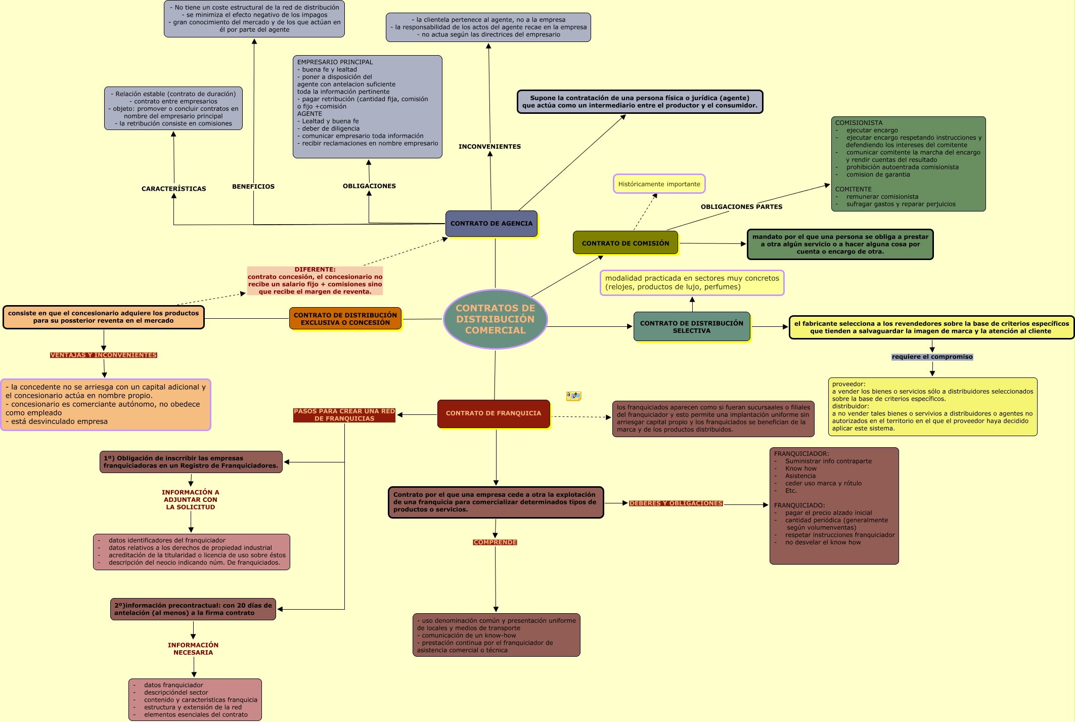 Este Cmap, tiene información relacionada con: ESCENARI 3, CONTRATO DE FRANQUICIA ???? los franquiciados aparecen como si fueran sucursaales o filiales del franquiciador y esto permite una implantación uniforme sin arriesgar capital propio y los franquiciados se benefician de la marca y de los productos distribuidos., CONTRATO DE AGENCIA ???? Supone la contratación de una persona física o jurídica (agente) que actúa como un intermediario entre el productor y el consumidor., CONTRATO DE FRANQUICIA ???? Contrato por el que una empresa cede a otra la explotación de una franquicia para comercializar determinados tipos de productos o servicios., CONTRATO DE DISTRIBUCIÓN SELECTIVA ???? el fabricante selecciona a los revendedores sobre la base de criterios específicos que tienden a salvaguardar la imagen de marca y la atención al cliente, el fabricante selecciona a los revendedores sobre la base de criterios específicos que tienden a salvaguardar la imagen de marca y la atención al cliente requiere el compromiso proveedor: a vender los bienes o servicios sólo a distribuidores seleccionados sobre la base de criterios específicos. distribuidor: a no vender tales bienes o servivios a distribuidores o agentes no autorizados en el territorio en el que el proveedor haya decidido aplicar este sistema., CONTRATO DE AGENCIA INCONVENIENTES - la clientela pertenece al agente, no a la empresa - la responsabilidad de los actos del agente recae en la empresa - no actua según las directrices del empresario, Contrato por el que una empresa cede a otra la explotación de una franquicia para comercializar determinados tipos de productos o servicios. COMPRENDE - uso denominación común y presentación uniforme de locales y medios de transporte - comunicación de un know-how - prestación continua por el franquiciador de asistencia comercial o técnica, CONTRATOS DE DISTRIBUCIÓN COMERCIAL CONTRATO DE DISTRIBUCIÓN SELECTIVA, 1º) Obligación de inscrribir las empresas franquiciadoras en un Registro de Franquiciadores. INFORMACIÓN A ADJUNTAR CON LA SOLICITUD - datos identificadores del franquiciador - datos relativos a los derechos de propiedad industrial - acreditación de la titularidad o licencia de uso sobre éstos - descripción del neocio indicando núm. De franquiciados., CONTRATO DE DISTRIBUCIÓN EXCLUSIVA O CONCESIÓN ???? consiste en que el concesionario adquiere los productos para su possterior reventa en el mercado, CONTRATO DE COMISIÓN ???? mandato por el que una persona se obliga a prestar a otra algún servicio o a hacer alguna cosa por cuenta o encargo de otra., CONTRATOS DE DISTRIBUCIÓN COMERCIAL CONTRATO DE AGENCIA, CONTRATO DE AGENCIA CARACTERÍSTICAS - Relación estable (contrato de duración) - contrato entre empresarios - objeto: promover o concluir contratos en nombre del empresario principal - la retribución consiste en comisiones, CONTRATO DE AGENCIA BENEFICIOS - No tiene un coste estructural de la red de distribución - se minimiza el efecto negativo de los impagos - gran conocimiento del mercado y de los que actúan en él por parte del agente, CONTRATO DE AGENCIA OBLIGACIONES EMPRESARIO PRINCIPAL - buena fe y lealtad - poner a disposición del agente con antelacion suficiente toda la información pertinente - pagar retribución (cantidad fija, comisión o fijo +comisión AGENTE - Lealtad y buena fe - deber de diligencia - comunicar empresario toda información - recibir reclamaciones en nombre empresario, 2º)información precontractual: con 20 días de antelación (al menos) a la firma contrato INFORMACIÓN NECESARIA - datos franquiciador - descripcióndel sector - contenido y caracteristicas franquicia - estructura y extensión de la red - elementos esenciales del contrato, consiste en que el concesionario adquiere los productos para su possterior reventa en el mercado DIFERENTE: contrato concesión, el concesionario no recibe un salario fijo + comisiones sino que recibe el margen de reventa. CONTRATO DE AGENCIA, consiste en que el concesionario adquiere los productos para su possterior reventa en el mercado VENTAJAS Y INCONVENIENTES - la concedente no se arriesga con un capital adicional y el concesionario actúa en nombre propio. - concesionario es comerciante autónomo, no obedece como empleado - está desvinculado empresa, CONTRATO DE FRANQUICIA PASOS PARA CREAR UNA RED DE FRANQUICIAS 2º)información precontractual: con 20 días de antelación (al menos) a la firma contrato, CONTRATOS DE DISTRIBUCIÓN COMERCIAL ???? CONTRATO DE COMISIÓN