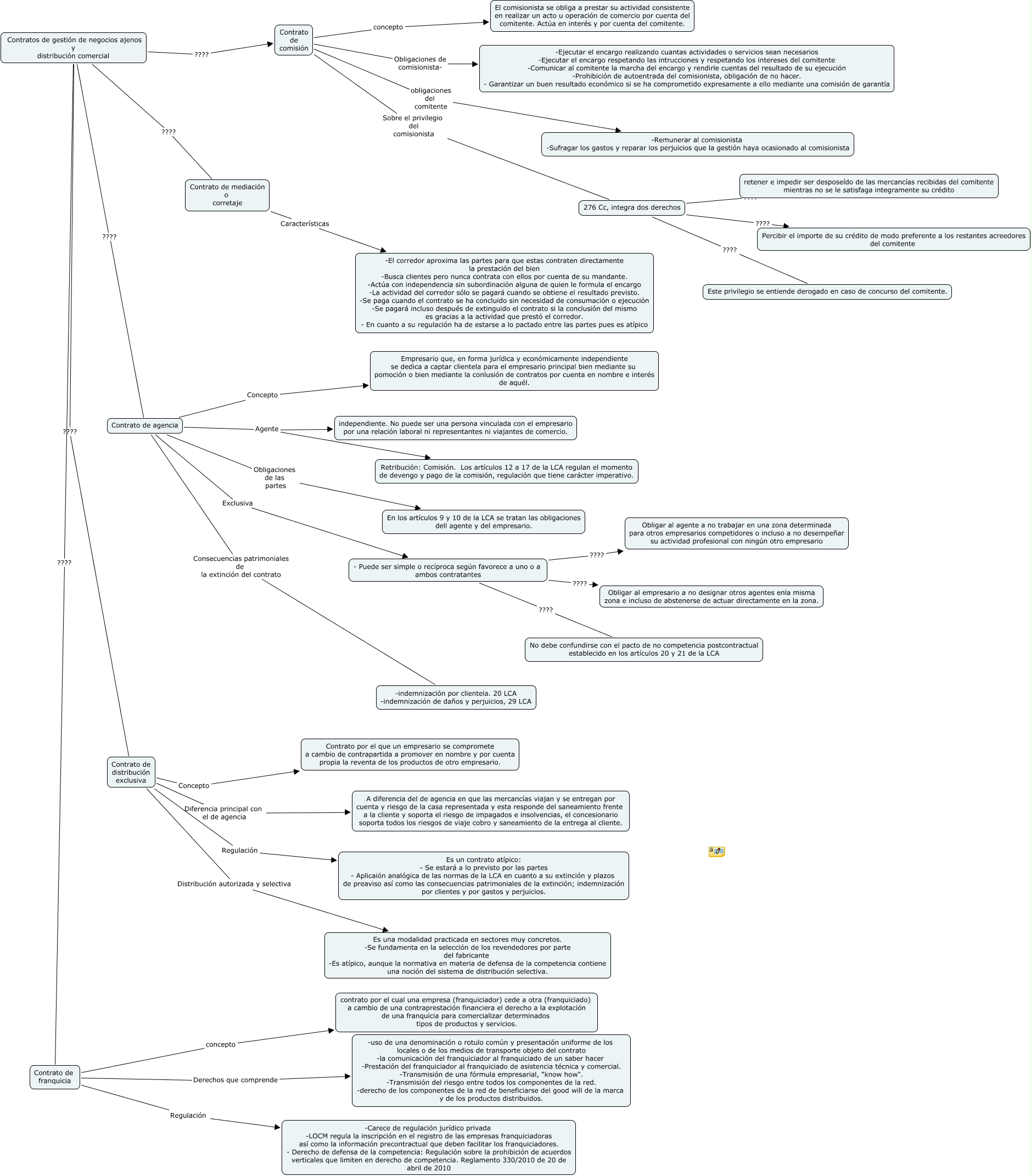 Este Cmap, tiene información relacionada con: Gestión de negocios ajenos y distribución comercial, Contrato de distribución exclusiva Distribución autorizada y selectiva Es una modalidad practicada en sectores muy concretos. -Se fundamenta en la selección de los revendedores por parte del fabricante -Es atípico, aunque la normativa en materia de defensa de la competencia contiene una noción del sistema de distribución selectiva., - Puede ser simple o recíproca según favorece a uno o a ambos contratantes ???? Obligar al agente a no trabajar en una zona determinada para otros empresarios competidores o incluso a no desempeñar su actividad profesional con ningún otro empresario, Contrato de franquicia Derechos que comprende -uso de una denominación o rotulo común y presentación uniforme de los locales o de los medios de transporte objeto del contrato -la comunicación del franquiciador al franquiciado de un saber hacer -Prestación del franquiciador al franquiciado de asistencia técnica y comercial. -Transmisión de una fórmula empresarial, "know how". -Transmisión del riesgo entre todos los componentes de la red. -derecho de los componentes de la red de beneficiarse del good will de la marca y de los productos distribuidos., - Puede ser simple o recíproca según favorece a uno o a ambos contratantes ???? Obligar al empresario a no designar otros agentes enla misma zona e incluso de abstenerse de actuar directamente en la zona., Contrato de agencia Obligaciones de las partes En los artículos 9 y 10 de la LCA se tratan las obligaciones dell agente y del empresario., Contrato de agencia Consecuencias patrimoniales de la extinción del contrato -indemnización por clientela. 20 LCA -indemnización de daños y perjuicios, 29 LCA, Contratos de gestión de negocios ajenos y distribución comercial ???? Contrato de distribución exclusiva, Contratos de gestión de negocios ajenos y distribución comercial ???? Contrato de franquicia, Contratos de gestión de negocios ajenos y distribución comercial ???? Contrato de mediación o corretaje, Contrato de agencia Exclusiva - Puede ser simple o recíproca según favorece a uno o a ambos contratantes, Contrato de comisión concepto El comisionista se obliga a prestar su actividad consistente en realizar un acto u operación de comercio por cuenta del comitente. Actúa en interés y por cuenta del comitente., Contrato de comisión Sobre el privilegio del comisionista 276 Cc, integra dos derechos, Contrato de comisión obligaciones del comitente -Remunerar al comisionista -Sufragar los gastos y reparar los perjuicios que la gestión haya ocasionado al comisionista, - Puede ser simple o recíproca según favorece a uno o a ambos contratantes ???? No debe confundirse con el pacto de no competencia postcontractual establecido en los artículos 20 y 21 de la LCA, Contrato de franquicia Regulación -Carece de regulación jurídico privada -LOCM regula la inscripción en el registro de las empresas franquiciadoras así como la información precontractual que deben facilitar los franquiciadores. - Derecho de defensa de la competencia: Regulación sobre la prohibición de acuerdos verticales que limiten en derecho de competencia. Reglamento 330/2010 de 20 de abril de 2010, Contratos de gestión de negocios ajenos y distribución comercial ???? Contrato de comisión, Contrato de agencia Agente Retribución: Comisión. Los artículos 12 a 17 de la LCA regulan el momento de devengo y pago de la comisión, regulación que tiene carácter imperativo., 276 Cc, integra dos derechos ???? retener e impedir ser desposeído de las mercancías recibidas del comitente mientras no se le satisfaga integramente su crédito, Contrato de distribución exclusiva Diferencia principal con el de agencia A diferencia del de agencia en que las mercancías viajan y se entregan por cuenta y riesgo de la casa representada y esta responde del saneamiento frente a la cliente y soporta el riesgo de impagados e insolvencias, el concesionario soporta todos los riesgos de viaje cobro y saneamiento de la entrega al cliente., Contrato de distribución exclusiva Regulación Es un contrato atípico: - Se estará a lo previsto por las partes - Aplicaión analógica de las normas de la LCA en cuanto a su extinción y plazos de preaviso así como las consecuencias patrimoniales de la extinción; indemnización por clientes y por gastos y perjuicios.