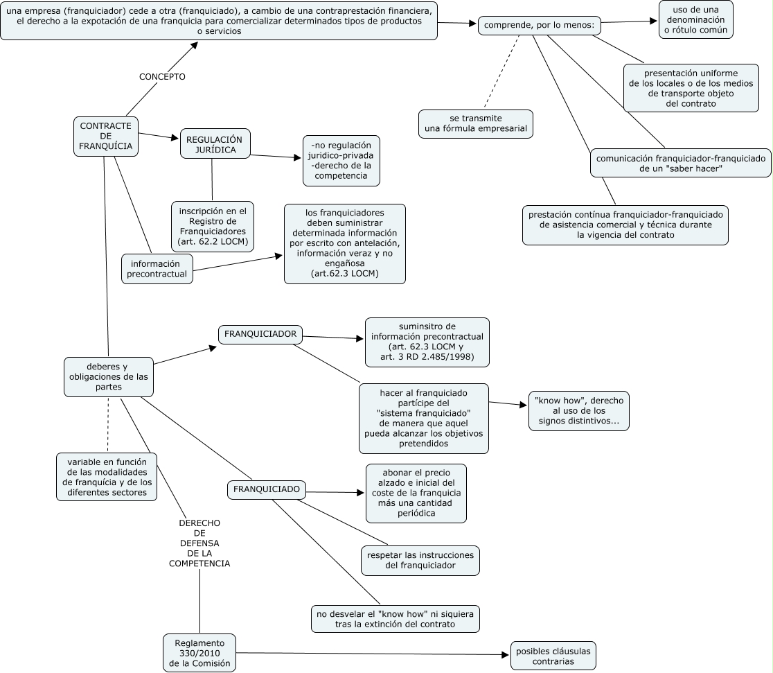 Este Cmap, tiene información relacionada con: cto franquicia, comprende, por lo menos: ???? comunicación franquiciador-franquiciado de un "saber hacer", FRANQUICIADOR ???? suminsitro de información precontractual (art. 62.3 LOCM y art. 3 RD 2.485/1998), CONTRACTE DE FRANQUÍCIA CONCEPTO una empresa (franquiciador) cede a otra (franquiciado), a cambio de una contraprestación financiera, el derecho a la expotación de una franquicia para comercializar determinados tipos de productos o servicios, FRANQUICIADO ???? respetar las instrucciones del franquiciador, deberes y obligaciones de las partes ???? FRANQUICIADO, FRANQUICIADO ???? abonar el precio alzado e inicial del coste de la franquicia más una cantidad periódica, comprende, por lo menos: ???? uso de una denominación o rótulo común, FRANQUICIADO ???? no desvelar el "know how" ni siquiera tras la extinción del contrato, CONTRACTE DE FRANQUÍCIA ???? deberes y obligaciones de las partes, comprende, por lo menos: ???? se transmite una fórmula empresarial, comprende, por lo menos: ???? presentación uniforme de los locales o de los medios de transporte objeto del contrato, REGULACIÓN JURÍDICA ???? inscripción en el Registro de Franquiciadores (art. 62.2 LOCM), información precontractual ???? los franquiciadores deben suministrar determinada información por escrito con antelación, información veraz y no engañosa (art.62.3 LOCM), FRANQUICIADOR ???? hacer al franquiciado partícipe del "sistema franquiciado" de manera que aquel pueda alcanzar los objetivos pretendidos, hacer al franquiciado partícipe del "sistema franquiciado" de manera que aquel pueda alcanzar los objetivos pretendidos ???? "know how", derecho al uso de los signos distintivos..., deberes y obligaciones de las partes ???? FRANQUICIADOR, CONTRACTE DE FRANQUÍCIA ???? información precontractual, REGULACIÓN JURÍDICA ???? -no regulación juridico-privada -derecho de la competencia, Reglamento 330/2010 de la Comisión ???? posibles cláusulas contrarias, deberes y obligaciones de las partes ???? variable en función de las modalidades de franquícia y de los diferentes sectores
