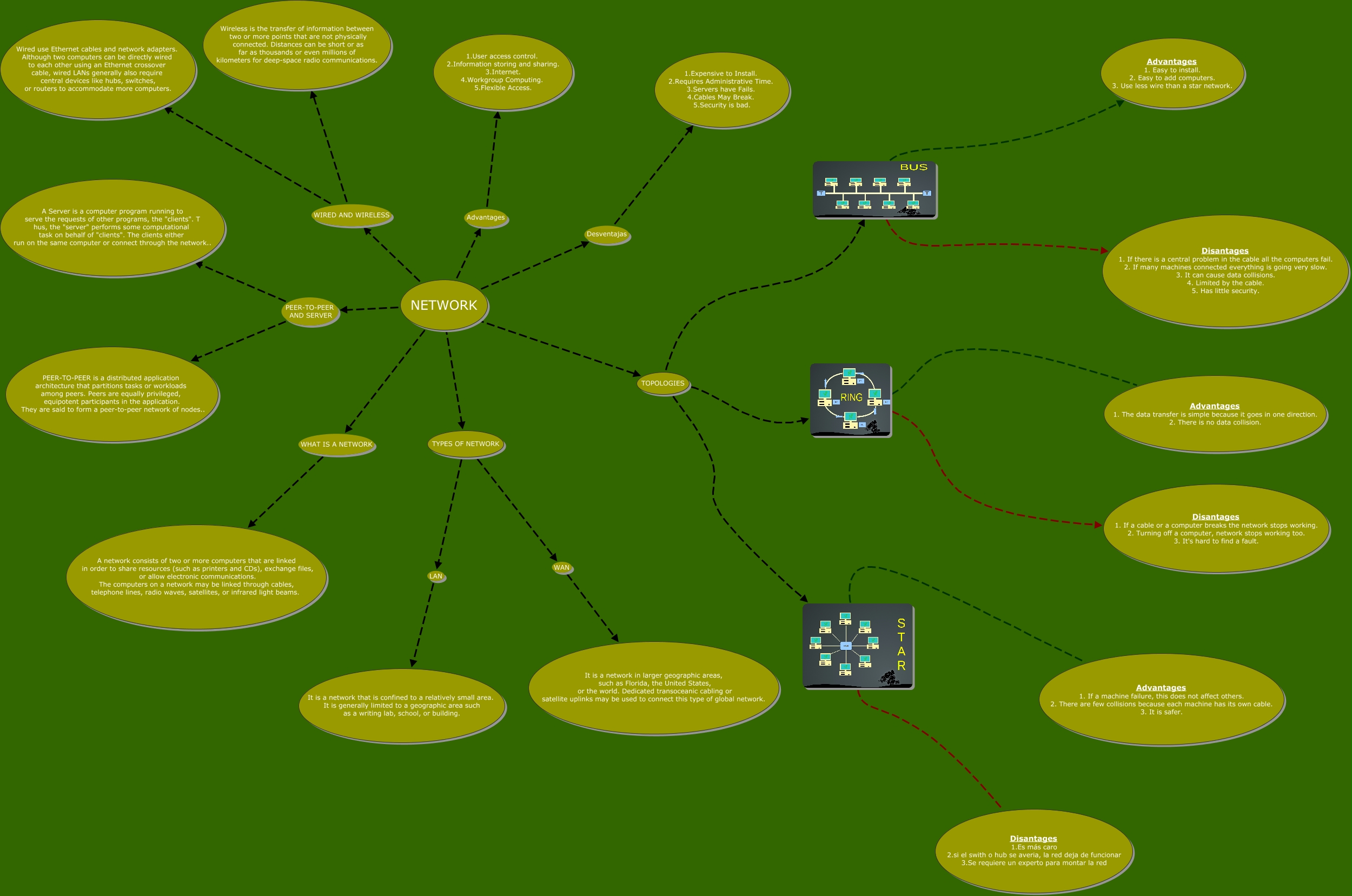 This Concept Map, created with IHMC CmapTools, has information related to: Untitled, NETWORK PEER-TO-PEER AND SERVER A Server is a computer program running to serve the requests of other programs, the "clients". T hus, the "server" performs some computational task on behalf of "clients". The clients either run on the same computer or connect through the network.., TOPOLOGIES Disantages 1.Es más caro 2.si el swith o hub se averia, la red deja de funcionar 3.Se requiere un experto para montar la red, TYPES OF NETWORK LAN It is a network that is confined to a relatively small area. It is generally limited to a geographic area such as a writing lab, school, or building., NETWORK Advantages 1.User access control. 2.Information storing and sharing. 3.Internet. 4.Workgroup Computing. 5.Flexible Access., NETWORK WIRED AND WIRELESS Wireless is the transfer of information between two or more points that are not physically connected. Distances can be short or as far as thousands or even millions of kilometers for deep-space radio communications., NETWORK WIRED AND WIRELESS Wired use Ethernet cables and network adapters. Although two computers can be directly wired to each other using an Ethernet crossover cable, wired LANs generally also require central devices like hubs, switches, or routers to accommodate more computers., TOPOLOGIES Disantages 1. If a cable or a computer breaks the network stops working. 2. Turning off a computer, network stops working too. 3. It's hard to find a fault., NETWORK PEER-TO-PEER AND SERVER PEER-TO-PEER is a distributed application architecture that partitions tasks or workloads among peers. Peers are equally privileged, equipotent participants in the application. They are said to form a peer-to-peer network of nodes.., TOPOLOGIES Advantages 1. If a machine failure, this does not affect others. 2. There are few collisions because each machine has its own cable. 3. It is safer., TOPOLOGIES Disantages 1. If there is a central problem in the cable all the computers fail. 2. If many machines connected everything is going very slow. 3. It can cause data collisions. 4. Limited by the cable. 5. Has little security., NETWORK WHAT IS A NETWORK A network consists of two or more computers that are linked in order to share resources (such as printers and CDs), exchange files, or allow electronic communications. The computers on a network may be linked through cables, telephone lines, radio waves, satellites, or infrared light beams., NETWORK Desventajas 1.Expensive to Install. 2.Requires Administrative Time. 3.Servers have Fails. 4.Cables May Break. 5.Security is bad., TYPES OF NETWORK WAN It is a network in larger geographic areas, such as Florida, the United States, or the world. Dedicated transoceanic cabling or satellite uplinks may be used to connect this type of global network., TOPOLOGIES Advantages 1. The data transfer is simple because it goes in one direction. 2. There is no data collision., TOPOLOGIES Advantages 1. Easy to install. 2. Easy to add computers. 3. Use less wire than a star network.