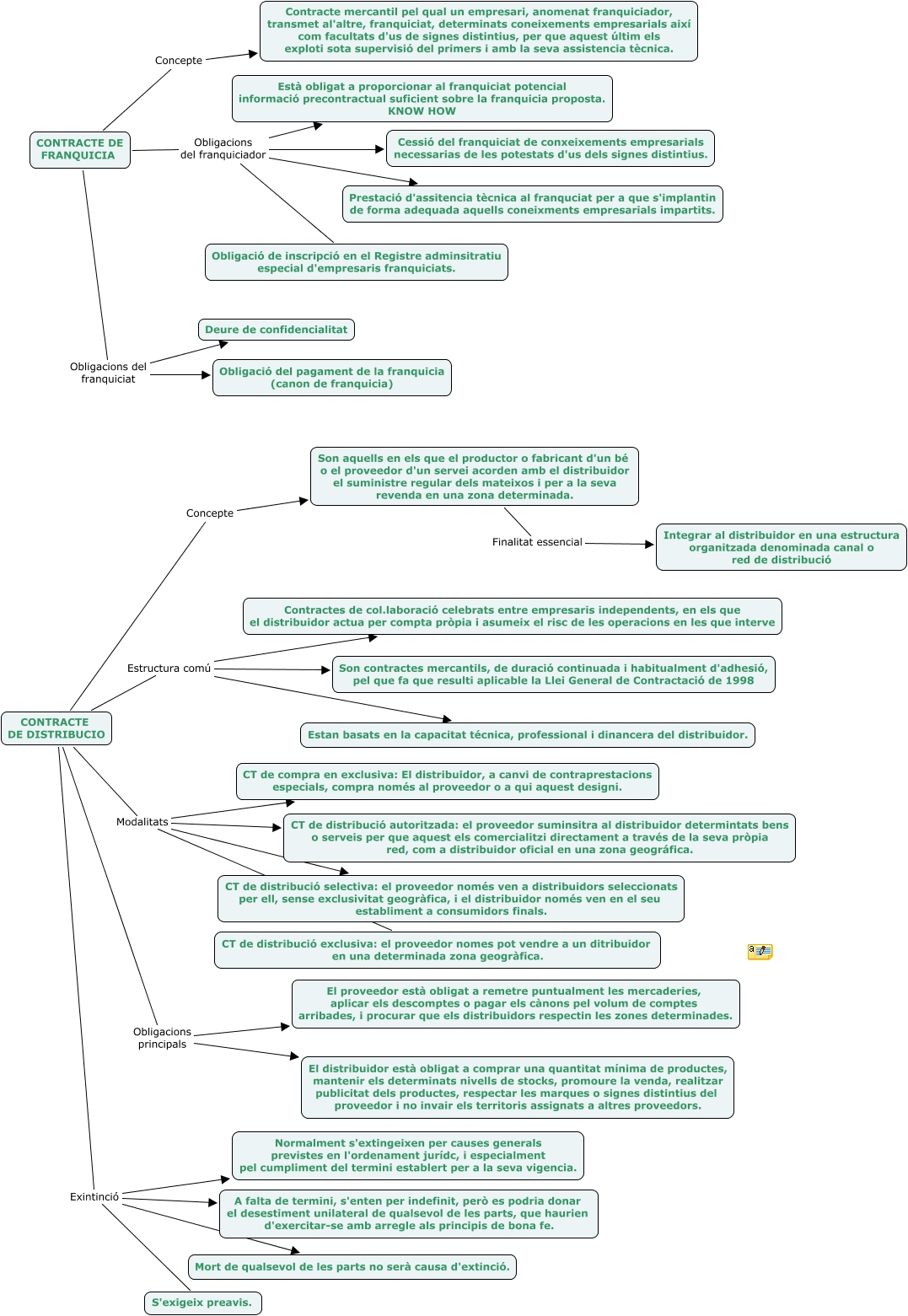 Este Cmap, tiene información relacionada con: Ct de distribució i franquicia, CONTRACTE DE FRANQUICIA Obligacions del franquiciador Està obligat a proporcionar al franquiciat potencial informació precontractual suficient sobre la franquicia proposta. KNOW HOW, CONTRACTE DE DISTRIBUCIO Modalitats CT de distribució selectiva: el proveedor només ven a distribuidors seleccionats per ell, sense exclusivitat geogràfica, i el distribuidor només ven en el seu establiment a consumidors finals., CONTRACTE DE DISTRIBUCIO Modalitats CT de distribució autoritzada: el proveedor suminsitra al distribuidor determintats bens o serveis per que aquest els comercialitzi directament a través de la seva pròpia red, com a distribuidor oficial en una zona geográfica., CONTRACTE DE DISTRIBUCIO Estructura comú Son contractes mercantils, de duració continuada i habitualment d'adhesió, pel que fa que resulti aplicable la Llei General de Contractació de 1998, Son aquells en els que el productor o fabricant d'un bé o el proveedor d'un servei acorden amb el distribuidor el suministre regular dels mateixos i per a la seva revenda en una zona determinada. Finalitat essencial Integrar al distribuidor en una estructura organitzada denominada canal o red de distribució, CONTRACTE DE DISTRIBUCIO Estructura comú Estan basats en la capacitat técnica, professional i dinancera del distribuidor., CONTRACTE DE DISTRIBUCIO Obligacions principals El proveedor està obligat a remetre puntualment les mercaderies, aplicar els descomptes o pagar els cànons pel volum de comptes arribades, i procurar que els distribuidors respectin les zones determinades., CONTRACTE DE FRANQUICIA Obligacions del franquiciat Deure de confidencialitat, CONTRACTE DE FRANQUICIA Obligacions del franquiciador Obligació de inscripció en el Registre adminsitratiu especial d'empresaris franquiciats., CONTRACTE DE DISTRIBUCIO Exintinció Normalment s'extingeixen per causes generals previstes en l'ordenament jurídc, i especialment pel cumpliment del termini establert per a la seva vigencia., CONTRACTE DE DISTRIBUCIO Exintinció Mort de qualsevol de les parts no serà causa d'extinció., CONTRACTE DE DISTRIBUCIO Exintinció A falta de termini, s'enten per indefinit, però es podria donar el desestiment unilateral de qualsevol de les parts, que haurien d'exercitar-se amb arregle als principis de bona fe., CONTRACTE DE DISTRIBUCIO Concepte Son aquells en els que el productor o fabricant d'un bé o el proveedor d'un servei acorden amb el distribuidor el suministre regular dels mateixos i per a la seva revenda en una zona determinada., CONTRACTE DE DISTRIBUCIO Estructura comú Contractes de col.laboració celebrats entre empresaris independents, en els que el distribuidor actua per compta pròpia i asumeix el risc de les operacions en les que interve, CONTRACTE DE DISTRIBUCIO Modalitats CT de compra en exclusiva: El distribuidor, a canvi de contraprestacions especials, compra només al proveedor o a qui aquest designi., CONTRACTE DE DISTRIBUCIO Modalitats CT de distribució exclusiva: el proveedor nomes pot vendre a un ditribuidor en una determinada zona geogràfica., CONTRACTE DE FRANQUICIA Obligacions del franquiciador Prestació d'assitencia tècnica al franquciat per a que s'implantin de forma adequada aquells coneixments empresarials impartits., CONTRACTE DE FRANQUICIA Concepte Contracte mercantil pel qual un empresari, anomenat franquiciador, transmet al'altre, franquiciat, determinats coneixements empresarials així com facultats d'us de signes distintius, per que aquest últim els exploti sota supervisió del primers i amb la seva assistencia tècnica., CONTRACTE DE FRANQUICIA Obligacions del franquiciador Cessió del franquiciat de conxeixements empresarials necessarias de les potestats d'us dels signes distintius., CONTRACTE DE FRANQUICIA Obligacions del franquiciat Obligació del pagament de la franquicia (canon de franquicia)