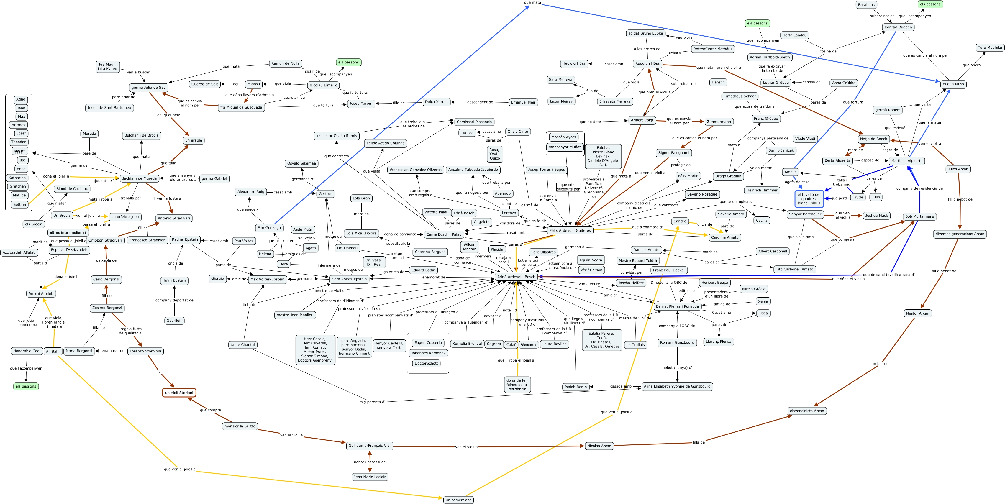 Aquest mapa conceptual conté informació relacionada amb: jo confesso, Herta Landau cosina de Konrad Budden, Eduard Badia galerista de Sara Voltes-Epstein, Fèlix Ardèvol i Guiteres pares de Daniela Amato, Pau Voltes casat amb Rachel Epstein, xèrif Carson actuen com a consciència d' Adrià Ardèvol i Bosch, Dora infermera de Sara Voltes-Epstein, Matthias Alpaerts talla i troba mig Trude, Came Bosch i Palau que visita Comissari Plasencia, Netje de Boeck sogra de Matthias Alpaerts, Nicolau Eimeric que fa torturar Josep Xarom, Caterina Fargues dona de confiança Adrià Ardèvol i Bosch, tante Chantal mig parenta d' Aline Elisabeth Yvonne de Gunzbourg, Fèlix Ardèvol i Guiteres que té d'empleats Cecília, Rudolph Höss casat amb Hedwig Höss, Kornelia Brendel companya a Tübingen d' Adrià Ardèvol i Bosch, Eugen Müss que opera Turu Mbulaka, monsier la Guitte ven el violí a Guillaume-François Vial, Gensana company d'estudis a la UB d' Adrià Ardèvol i Bosch, Aribert Voigt que mata a Fèlix Ardèvol i Guiteres, Fèlix Ardèvol i Guiteres que té d'empleats Senyor Berenguer