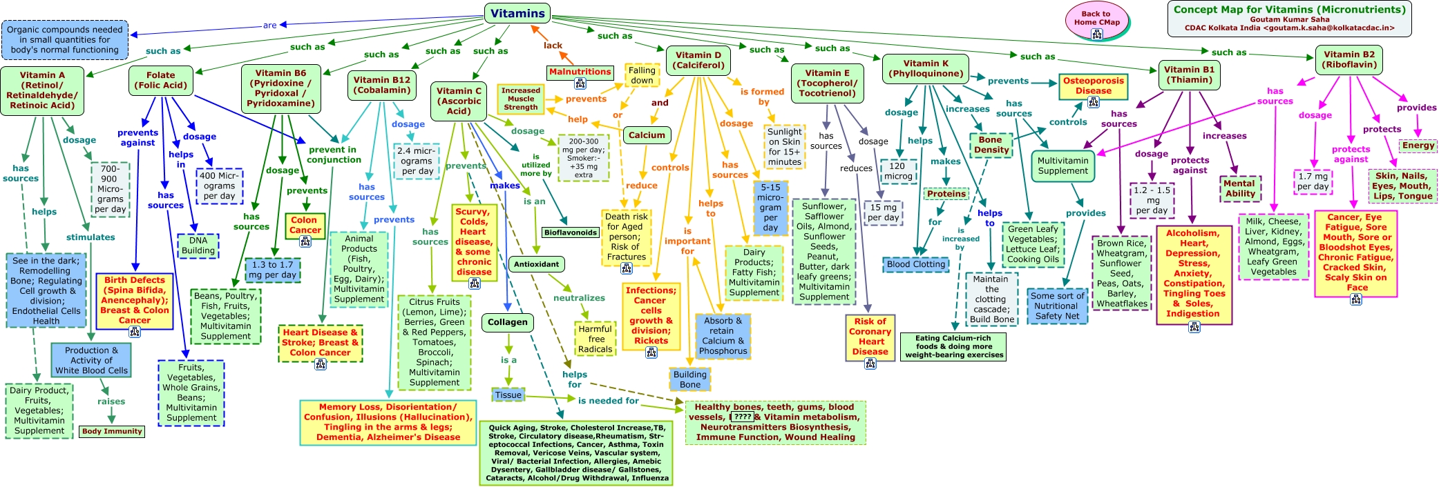 This Concept Map, created with IHMC CmapTools, has information related to: Vitamins Information Chart, Vitamin E (Tocopherol/ Tocotrienol) has sources Sunflower, Safflower Oils, Almond, Sunflower Seeds, Peanut, Butter, dark leafy greens; Multivitamin Supplement, Malnutritions lack Vitamins, Vitamin B1 (Thiamin) dosage 1.2 - 1.5 mg per day, Folate (Folic Acid) prevent in conjunction Heart Disease & Stroke; Breast & Colon Cancer, Vitamin B2 (Riboflavin) dosage 1.7 mg per day, Vitamin K (Phylloquinone) increases Bone Density, Vitamins such as Vitamin B1 (Thiamin), Vitamin A (Retinol/ Retinaldehyde/ Retinoic Acid) has sources Dairy Product, Fruits, Vegetables; Multivitamin Supplement, Vitamin B2 (Riboflavin) has sources Milk, Cheese, Liver, Kidney, Almond, Eggs, Wheatgram, Leafy Green Vegetables, Vitamin C (Ascorbic Acid) dosage 200-300 mg per day; Smoker:- +35 mg extra, Vitamin K (Phylloquinone) prevents Osteoporosis Disease, Vitamin B12 (Cobalamin) has sources Animal Products (Fish, Poultry, Egg, Dairy); Multivitamin Supplement, Vitamins such as Vitamin C (Ascorbic Acid), Vitamins such as Vitamin B2 (Riboflavin), Vitamin K (Phylloquinone) helps to Maintain the clotting cascade; Build Bone, Vitamin K (Phylloquinone) has sources Multivitamin Supplement, Vitamins are Organic compounds needed in small quantities for body's normal functioning, Falling down or Death risk for Aged person; Risk of Fractures, Vitamin B6 (Pyridoxine / Pyridoxal / Pyridoxamine) prevent in conjunction Heart Disease & Stroke; Breast & Colon Cancer, Proteins for Blood Clotting