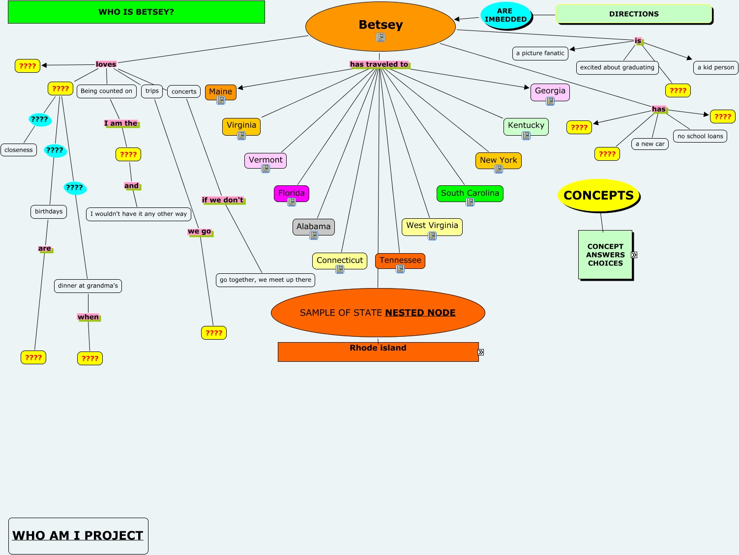This Concept Map, created with IHMC CmapTools, has information related to: BETSEY_WHO AM I COLLABORATION PROJECT, ???? ???? dinner at grandma's, ???? and I wouldn't have it any other way, Betsey has traveled to SAMPLE OF STATE NESTED NODE, CONCEPTS ARE IN YELLOW celebrated not only at Grandma's, but out too, Betsey is a picture fanatic, SAMPLE OF STATE NESTED NODE RHODE ISLAND state song, Betsey has traveled to Virginia, Betsey has traveled to West Virginia, Betsey has traveled to Florida, Betsey has traveled to Vermont, Being counted on I am the ????, Betsey loves ????, Betsey has traveled to Connecticut, DIRECTIONS ARE IMBEDDED Betsey, SAMPLE OF STATE NESTED NODE RHODE ISLAND 1. State of Rhode Island and Providence Plantations, SAMPLE OF STATE NESTED NODE RHODE ISLAND violet, Betsey has traveled to South Carolina, Betsey has ????, SAMPLE OF STATE NESTED NODE RHODE ISLAND 4 PROVIDENCE, Betsey has traveled to Tennessee