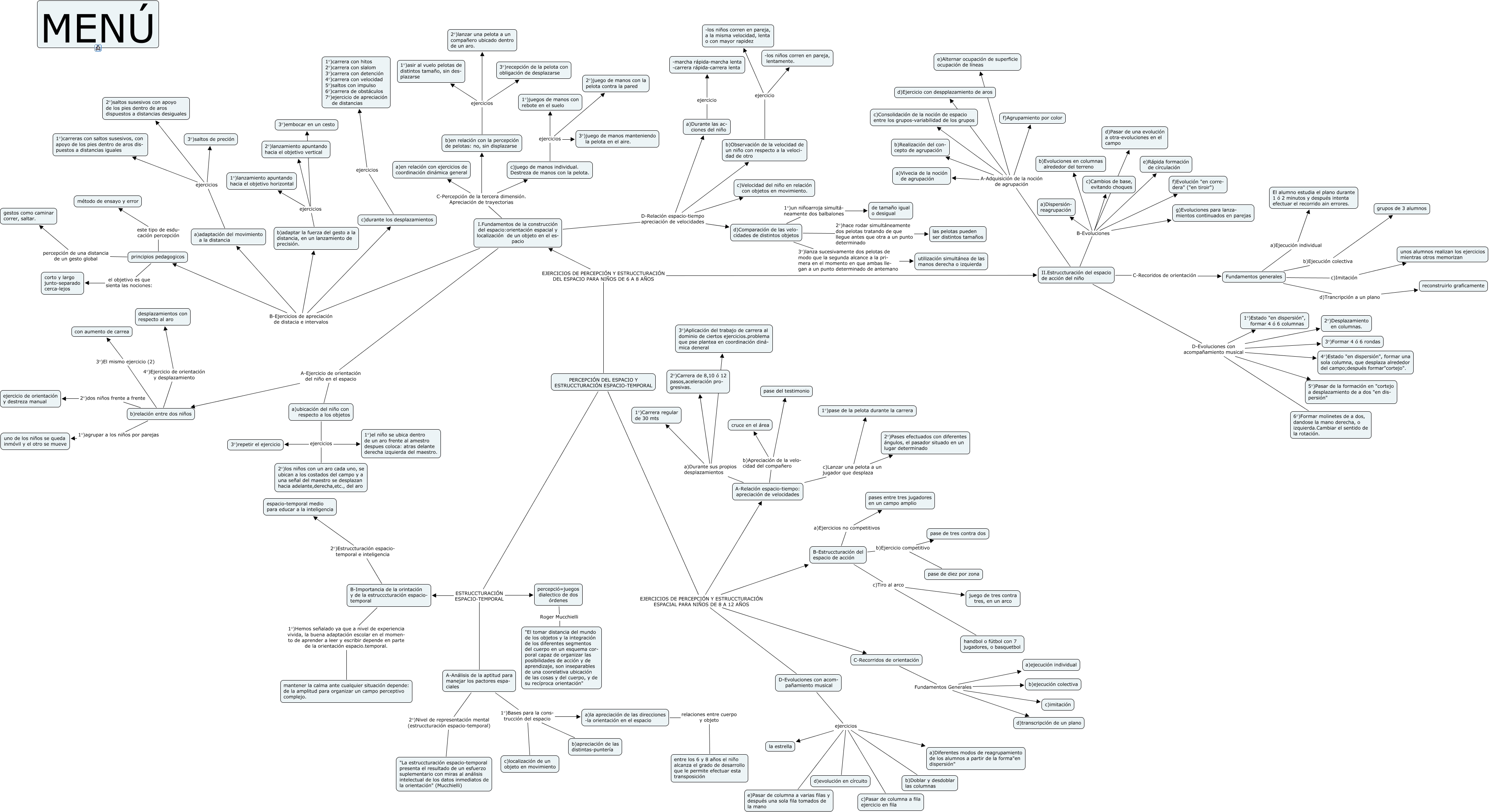Este Cmap, tiene información relacionada con: percepcion del espacio y estruccturación espacio-temporal, PERCEPCIÓN DEL ESPACIO Y ESTRUCCTURACIÓN ESPACIO-TEMPORAL ESTRUCCTURACIÓN ESPACIO-TEMPORAL A-Análisis de la aptitud para manejar los pactores espa- ciales, II.Estruccturación del espacio de acción del niño D-Evoluciones con acompañamiento musical 5°)Pasar de la formación en "cortejo a desplazamiento de a dos "en dis- persión", II.Estruccturación del espacio de acción del niño A-Adquisición de la noción de agrupación e)Alternar ocupación de superficie ocupación de líneas, percepció=juegos dialectico de dos órdenes Roger Mucchielli "El tomar distancia del mundo de los objetos y la integración de los diferentes segmentos del cuerpo en un esquema cor- poral capaz de organizar las posibilidades de acción y de aprendizaje, son inseparables de una coorelativa ubicación de las cosas y del cuerpo, y de su recíproca orientación", B-Estruccturación del espacio de acción a)Ejercicios no competitivos pases entre tres jugadores en un campo amplio, Fundamentos generales c)Imitación unos alumnos realizan los ejercicios mientras otros memorizan, D-Evoluciones con acom- pañamiento musical ejercicios e)Pasar de columna a varias filas y después una sola fila tomados de la mano, A-Análisis de la aptitud para manejar los pactores espa- ciales 1°)Bases para la cons- trucción del espacio c)localización de un objeto en movimiento, principios pedagogicos el objetivo es que sienta las nociones: corto y largo junto-separado cerca-lejos, PERCEPCIÓN DEL ESPACIO Y ESTRUCCTURACIÓN ESPACIO-TEMPORAL EJERCICIOS DE PERCEPCIÓN Y ESTRUCCTURACIÓN ESPACIAL PARA NIÑOS DE 8 A 12 AÑOS D-Evoluciones con acom- pañamiento musical, Fundamentos generales d)Trancripción a un plano reconstruirlo graficamente, b)relación entre dos niños 2°)dos niños frente a frente ejercicio de orientación y destreza manual, b)en relación con la percepción de pelotas: no, sin displazarse ejercicios 1°)asir al vuelo pelotas de distintos tamaño, sin des- plazarse, b)en relación con la percepción de pelotas: no, sin displazarse ejercicios 3°)recepción de la pelota con obligación de desplazarse, D-Evoluciones con acom- pañamiento musical ejercicios b)Doblar y desdoblar las columnas, C-Recorridos de orientación Fundamentos Generales a)ejecución individual, II.Estruccturación del espacio de acción del niño A-Adquisición de la noción de agrupación b)Realización del con- cepto de agrupación, b)adaptar la fuerza del gesto a la distancia, en un lanzamiento de precisión. ejercicios 3°)embocar en un cesto, a)ubicación del niño con respecto a los objetos ejercicios 1°)el niño se ubica dentro de un aro frente al amestro despues coloca: atras delante derecha izquierda del maestro., PERCEPCIÓN DEL ESPACIO Y ESTRUCCTURACIÓN ESPACIO-TEMPORAL ESTRUCCTURACIÓN ESPACIO-TEMPORAL B-Importancia de la orintación y de la estrucccturación espacio- temporal