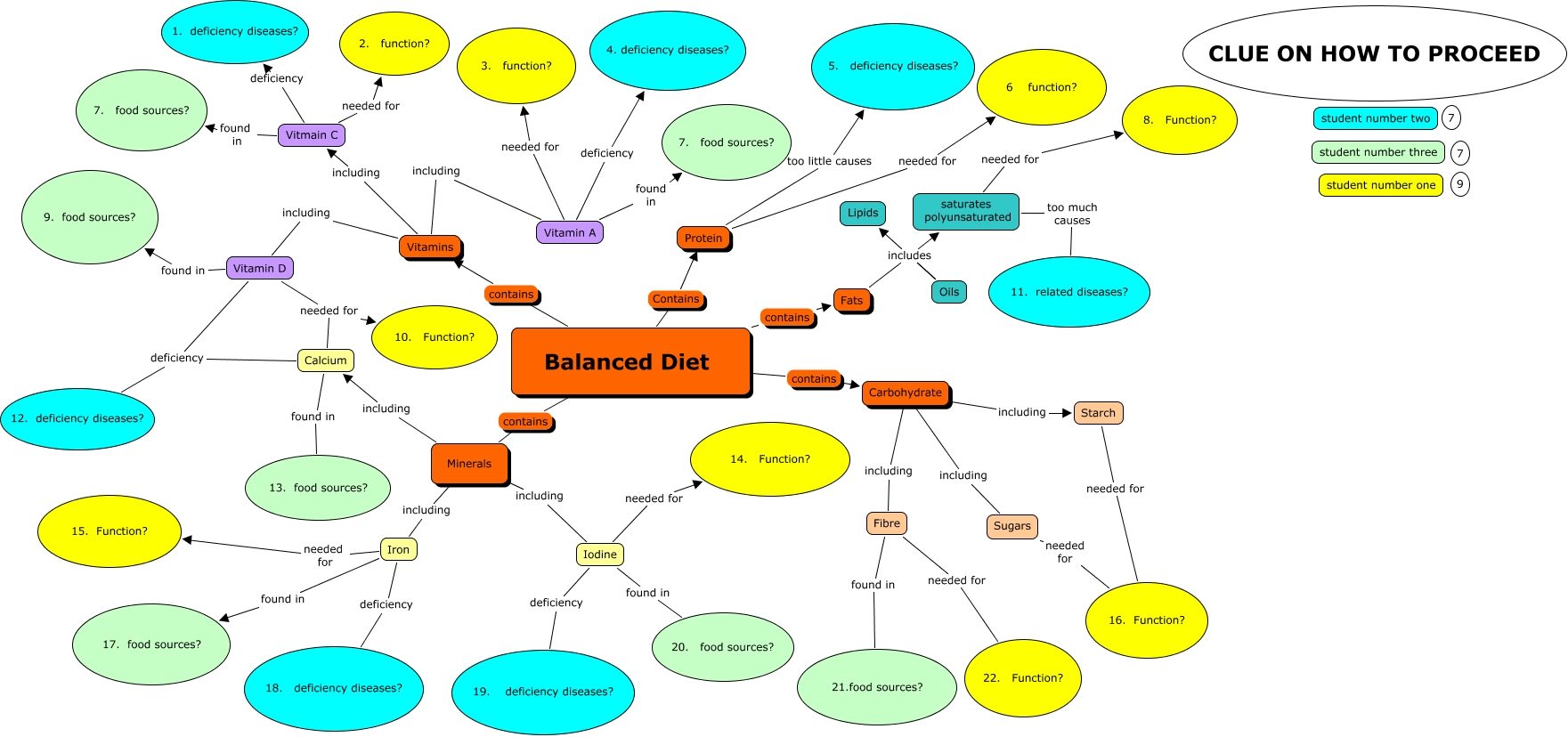 This Concept Map, created with IHMC CmapTools, has information related to: 2012-01-13 BALANCED DIET 20+ QUESTIONAIRE WITH CLUES, Balanced Diet Contains Protein, Sugars needed for 16. Function?, Vitamin A deficiency 4. deficiency diseases?, Fibre found in 21.food sources?, Minerals including Calcium, Starch needed for 16. Function?, Carbohydrate including Sugars, Calcium found in 13. food sources?, Iodine deficiency 19. deficiency diseases?, Vitmain C deficiency 1. deficiency diseases?, saturates polyunsaturated too much causes 11. related diseases?, Iodine found in 20. food sources?, Minerals including Iron, Vitamins including Vitmain C, Vitamin D found in 9. food sources?, Balanced Diet contains Vitamins, Carbohydrate including Fibre, Vitamin A found in 7. food sources?, Vitamins including Vitamin A, Calcium deficiency 12. deficiency diseases?