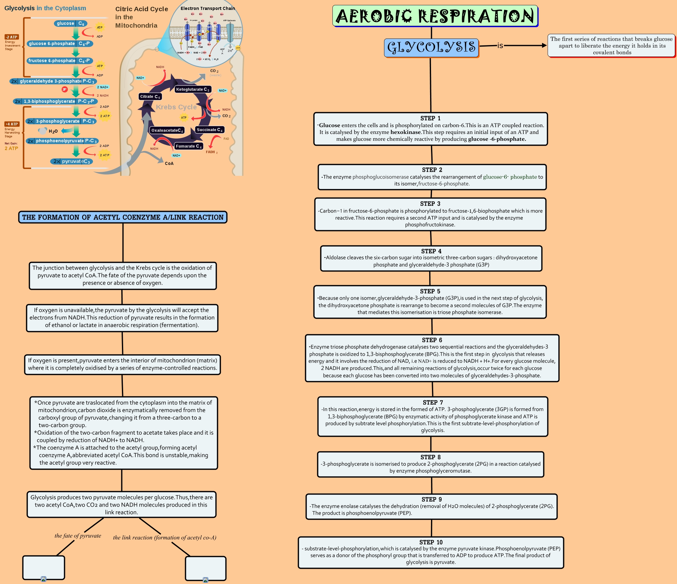 This Concept Map, created with IHMC CmapTools, has information related to: 15.2.1 Glycolysis_Ain Shafira, STEP 9 -The enzyme enolase catalyses the dehydration (removal of H2O molecules) of 2-phosphoglycerate (2PG). The product is phosphoenolpyruvate (PEP). ???? STEP 10 - substrate-level-phosphorylation,which is catalysed by the enzyme pyruvate kinase.Phosphoenolpyruvate (PEP) serves as a donor of the phosphoryl group that is transferred to ADP to produce ATP.The final product of glycolysis is pyruvate., *Once pyruvate are traslocated from the cytoplasm into the matrix of mitochondrion,carbon dioxide is enzymatically removed from the carboxyl group of pyruvate,changing it from a three-carbon to a two-carbon group. *Oxidation of the two-carbon fragment to acetate takes place and it is coupled by reduction of NADH+ to NADH. *The coenzyme A is attached to the acetyl group,forming acetyl coenzyme A,abbreviated acetyl CoA.This bond is unstable,making the acetyl group very reactive. ???? Glycolysis produces two pyruvate molecules per glucose.Thus,there are two acetyl CoA,two CO2 and two NADH molecules produced in this link reaction., STEP 5 -Because only one isomer,glyceraldehyde-3-phosphate (G3P),is used in the next step of glycolysis, the dihydroxyacetone phosphate is rearrange to become a second molecules of G3P.The enzyme that mediates this isomerisation is triose phosphate isomerase. ???? STEP 6 -Enzyme triose phosphate dehydrogenase catalyses two sequential reactions and the glyceraldehydes-3 phosphate is oxidized to 1,3-bisphosphoglycerate (BPG).This is the first step in glycolysis that releases energy and it involves the reduction of NAD, i.e NAD+ is reduced to NADH + H+.For every glucose molecule, 2 NADH are produced.This,and all remaining reactions of glycolysis,occur twice for each glucose because each glucose has been converted into two molecules of glyceraldehydes-3-phosphate., Glycolysis produces two pyruvate molecules per glucose.Thus,there are two acetyl CoA,two CO2 and two NADH molecules produced in this link reaction. the fate of pyruvate, STEP 3 -Carbon-1 in fructose-6-phosphate is phosphorylated to fructose-1,6-biophosphate which is more reactive.This reaction requires a second ATP input and is catalysed by the enzyme phosphofructokinase. ???? STEP 4 -Aldolase cleaves the six-carbon sugar into isometric three-carbon sugars : dihydroxyacetone phosphate and glyceraldehyde-3 phosphate (G3P), STEP 8 -3-phosphoglycerate is isomerised to produce 2-phosphoglycerate (2PG) in a reaction catalysed by enzyme phosphoglyceromutase. ???? STEP 9 -The enzyme enolase catalyses the dehydration (removal of H2O molecules) of 2-phosphoglycerate (2PG). The product is phosphoenolpyruvate (PEP)., STEP 1 -Glucose enters the cells and is phosphorylated on carbon-6.This is an ATP coupled reaction. It is catalysed by the enzyme hexokinase.This step requires an initial input of an ATP and makes glucose more chemically reactive by producing glucose -6-phosphate. ???? STEP 2 -The enzyme phosphoglucoisomerase catalyses the rearrangement of glucose-6- phosphate to its isomer,fructose-6-phosphate., If oxygen is present,pyruvate enters the interior of mitochondrion (matrix) where it is completely oxidised by a series of enzyme-controlled reactions. ???? *Once pyruvate are traslocated from the cytoplasm into the matrix of mitochondrion,carbon dioxide is enzymatically removed from the carboxyl group of pyruvate,changing it from a three-carbon to a two-carbon group. *Oxidation of the two-carbon fragment to acetate takes place and it is coupled by reduction of NADH+ to NADH. *The coenzyme A is attached to the acetyl group,forming acetyl coenzyme A,abbreviated acetyl CoA.This bond is unstable,making the acetyl group very reactive., GLYCOLYSIS ???? STEP 1 -Glucose enters the cells and is phosphorylated on carbon-6.This is an ATP coupled reaction. It is catalysed by the enzyme hexokinase.This step requires an initial input of an ATP and makes glucose more chemically reactive by producing glucose -6-phosphate., STEP 7 -In this reaction,energy is stored in the formed of ATP. 3-phosphoglycerate (3GP) is formed from 1,3-biphosphoglycerate (BPG) by enzymatic activity of phosphoglycerate kinase and ATP is produced by subtrate level phosphorylation.This is the first subtrate-level-phosphorylation of glycolysis. ???? STEP 8 -3-phosphoglycerate is isomerised to produce 2-phosphoglycerate (2PG) in a reaction catalysed by enzyme phosphoglyceromutase., STEP 6 -Enzyme triose phosphate dehydrogenase catalyses two sequential reactions and the glyceraldehydes-3 phosphate is oxidized to 1,3-bisphosphoglycerate (BPG).This is the first step in glycolysis that releases energy and it involves the reduction of NAD, i.e NAD+ is reduced to NADH + H+.For every glucose molecule, 2 NADH are produced.This,and all remaining reactions of glycolysis,occur twice for each glucose because each glucose has been converted into two molecules of glyceraldehydes-3-phosphate. ???? STEP 7 -In this reaction,energy is stored in the formed of ATP. 3-phosphoglycerate (3GP) is formed from 1,3-biphosphoglycerate (BPG) by enzymatic activity of phosphoglycerate kinase and ATP is produced by subtrate level phosphorylation.This is the first subtrate-level-phosphorylation of glycolysis., GLYCOLYSIS is The first series of reactions that breaks glucose apart to liberate the energy it holds in its covalent bonds, THE FORMATION OF ACETYL COENZYME A/LINK REACTION ???? The junction between glycolysis and the Krebs cycle is the oxidation of pyruvate to acetyl CoA.The fate of the pyruvate depends upon the presence or absence of oxygen., STEP 4 -Aldolase cleaves the six-carbon sugar into isometric three-carbon sugars : dihydroxyacetone phosphate and glyceraldehyde-3 phosphate (G3P) ???? STEP 5 -Because only one isomer,glyceraldehyde-3-phosphate (G3P),is used in the next step of glycolysis, the dihydroxyacetone phosphate is rearrange to become a second molecules of G3P.The enz