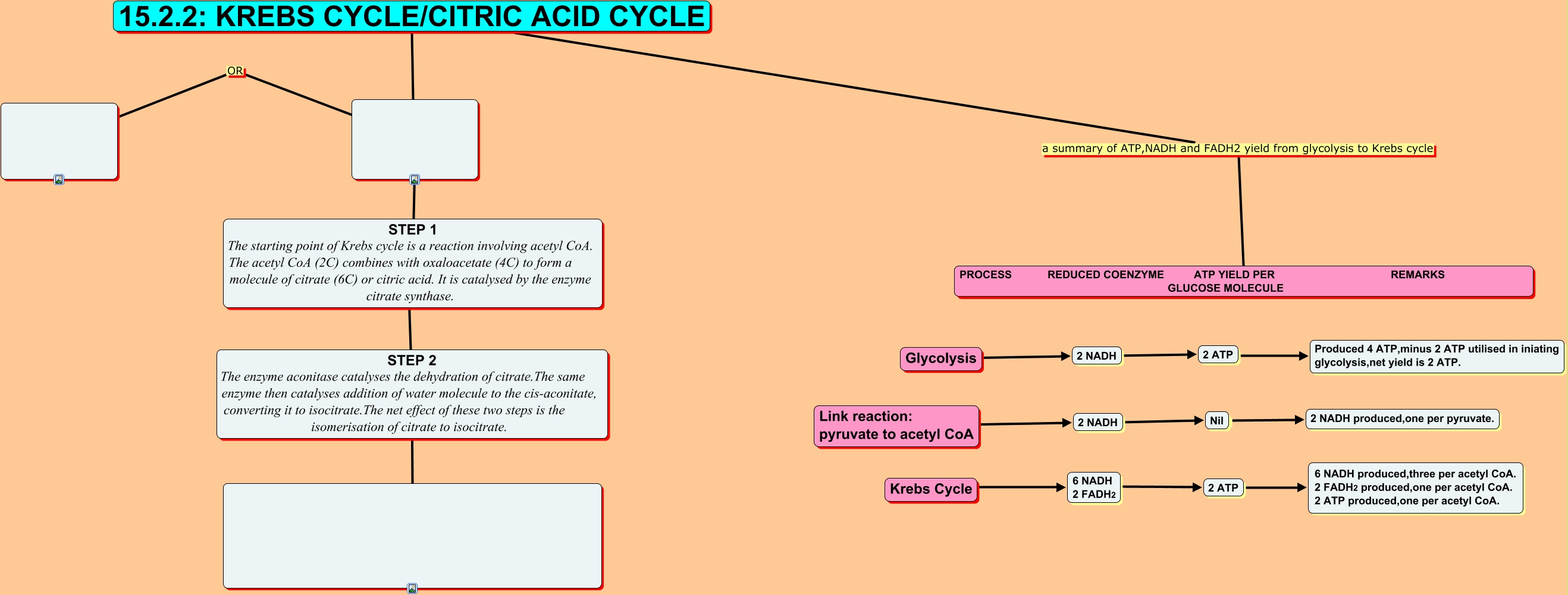 This Concept Map, created with IHMC CmapTools, has information related to: 15.2.2 Krebs Cycle, 15.2.2: KREBS CYCLE/CITRIC ACID CYCLE ????, 2 ATP ???? 6 NADH produced,three per acetyl CoA. 2 FADH2 produced,one per acetyl CoA. 2 ATP produced,one per acetyl CoA., Link reaction: pyruvate to acetyl CoA ???? 2 NADH, 2 NADH ???? Nil, 2 NADH ???? 2 ATP, Glycolysis ???? 2 NADH, STEP 2 The enzyme aconitase catalyses the dehydration of citrate.The same enzyme then catalyses addition of water molecule to the cis-aconitate, converting it to isocitrate.The net effect of these two steps is the isomerisation of citrate to isocitrate. ????, STEP 1 The starting point of Krebs cycle is a reaction involving acetyl CoA. The acetyl CoA (2C) combines with oxaloacetate (4C) to form a molecule of citrate (6C) or citric acid. It is catalysed by the enzyme citrate synthase. ???? STEP 2 The enzyme aconitase catalyses the dehydration of citrate.The same enzyme then catalyses addition of water molecule to the cis-aconitate, converting it to isocitrate.The net effect of these two steps is the isomerisation of citrate to isocitrate., OR, ???? STEP 1 The starting point of Krebs cycle is a reaction involving acetyl CoA. The acetyl CoA (2C) combines with oxaloacetate (4C) to form a molecule of citrate (6C) or citric acid. It is catalysed by the enzyme citrate synthase., Nil ???? 2 NADH produced,one per pyruvate., 6 NADH 2 FADH2 ???? 2 ATP, 15.2.2: KREBS CYCLE/CITRIC ACID CYCLE a summary of ATP,NADH and FADH2 yield from glycolysis to Krebs cycle PROCESS REDUCED COENZYME ATP YIELD PER REMARKS GLUCOSE MOLECULE, 2 ATP ???? Produced 4 ATP,minus 2 ATP utilised in iniating glycolysis,net yield is 2 ATP., Krebs Cycle ???? 6 NADH 2 FADH2