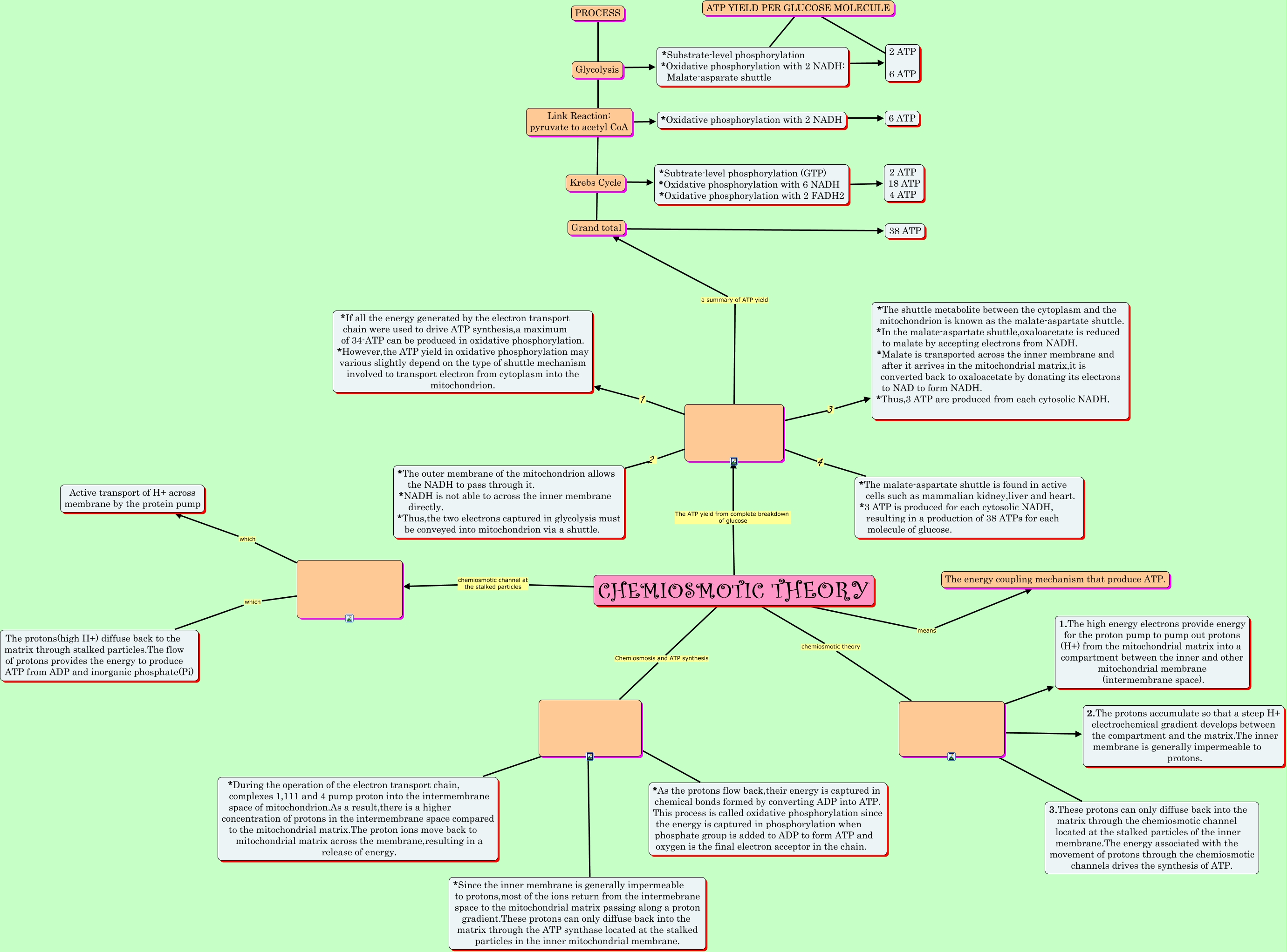 This Concept Map, created with IHMC CmapTools, has information related to: 15.2.3.b Chemiostic Theory, CHEMIOSMOTIC THEORY Chemiosmosis and ATP synthesis, CHEMIOSMOTIC THEORY The ATP yield from complete breakdown of glucose, ATP YIELD PER GLUCOSE MOLECULE ???? 2 ATP 6 ATP, 1 *If all the energy generated by the electron transport chain were used to drive ATP synthesis,a maximum of 34-ATP can be produced in oxidative phosphorylation. *However,the ATP yield in oxidative phosphorylation may various slightly depend on the type of shuttle mechanism involved to transport electron from cytoplasm into the mitochondrion., PROCESS ???? Grand total, Glycolysis ???? *Substrate-level phosphorylation *Oxidative phosphorylation with 2 NADH: Malate-asparate shuttle, which Active transport of H+ across membrane by the protein pump, 4 *The malate-aspartate shuttle is found in active cells such as mammalian kidney,liver and heart. *3 ATP is produced for each cytosolic NADH, resulting in a production of 38 ATPs for each molecule of glucose., CHEMIOSMOTIC THEORY means The energy coupling mechanism that produce ATP., PROCESS ???? Link Reaction: pyruvate to acetyl CoA, ???? ????, *Subtrate-level phosphorylation (GTP) *Oxidative phosphorylation with 6 NADH *Oxidative phosphorylation with 2 FADH2 ???? 2 ATP 18 ATP 4 ATP, Krebs Cycle ???? *Subtrate-level phosphorylation (GTP) *Oxidative phosphorylation with 6 NADH *Oxidative phosphorylation with 2 FADH2, ???? *As the protons flow back,their energy is captured in chemical bonds formed by converting ADP into ATP. This process is called oxidative phosphorylation since the energy is captured in phosphorylation when phosphate group is added to ADP to form ATP and oxygen is the final electron acceptor in the chain., Link Reaction: pyruvate to acetyl CoA ???? *Oxidative phosphorylation with 2 NADH, *Oxidative phosphorylation with 2 NADH ???? 6 ATP, ???? 1.The high energy electrons provide energy for the proton pump to pump out protons (H+) from the mitochondrial matrix into a compartment between the inner and other mitochondrial membrane (intermembrane space)., 2 *The outer membrane of the mitochondrion allows the NADH to pass through it. *NADH is not able to across the inner membrane directly. *Thus,the two electrons captured in glycolysis must be conveyed into mitochondrion via a shuttle., ???? ???? *Since the inner membrane is generally impermeable to protons,most of the ions return from the intermebrane space to the mitochondrial matrix passing along a proton gradient.These protons can only diffuse back into the matrix through the ATP synthase located at the stalked particles in the inner mitochondrial membrane., ATP YIELD PER GLUCOSE MOLECULE ???? *Substrate-level phosphorylation *Oxidative phosphorylation with 2 NADH: Malate-asparate shuttle