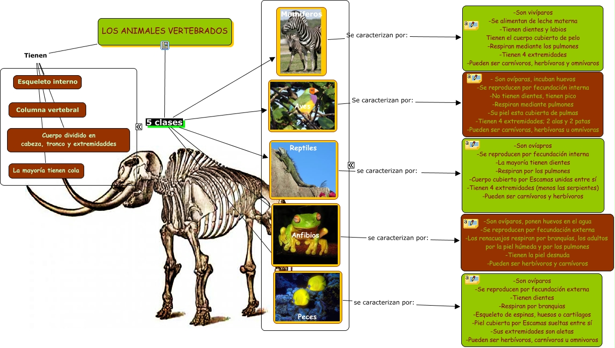 Este Cmap, tiene información relacionada con: Animales vertebrados, LOS ANIMALES VERTEBRADOS Tienen Cuerpo dividido en cabeza, tronco y extremidaddes, LOS ANIMALES VERTEBRADOS 5 clases Anfibios, Peces se caracterizan por: -Son ovíparos -Se reproducen por fecundación externa -Tienen dientes -Respiran por branquias -Esqueleto de espinas, huesos o cartilagos -Piel cubierta por Escamas sueltas entre sí -Sus extremidades son aletas -Pueden ser herbívoros, carnívoros u omnivoros, LOS ANIMALES VERTEBRADOS Tienen Esqueleto interno, Anfibios se caracterizan por: -Son ovíparos, ponen huevos en el agua -Se reproducen por fecundación externa -Los renacuajos respiran por branquías, los adultos por la piel húmeda y por los pulmones -Tienen la piel desnuda -Pueden ser herbívoros y carnívoros, LOS ANIMALES VERTEBRADOS 5 clases Aves, LOS ANIMALES VERTEBRADOS 5 clases Reptiles, Mamiferos Se caracterizan por: -Son vivíparos -Se alimentan de leche materna -Tienen dientes y labios Tienen el cuerpo cubierto de pelo -Respiran mediante los pulmones -Tienen 4 extremidades -Pueden ser carnívoros, herbívoros y omnívaros, LOS ANIMALES VERTEBRADOS 5 clases Mamiferos, LOS ANIMALES VERTEBRADOS 5 clases Peces, Aves Se caracterizan por: - Son ovíparas, incuban huevos -Se reproducen por fecundación interna -No tienen dientes, tienen pico -Respiran mediante pulmones -Su piel esta cubierta de pulmas -Tienen 4 extremidades; 2 alas y 2 patas -Pueden ser carnívoras, herbívoras u omnívoras, LOS ANIMALES VERTEBRADOS Tienen La mayoría tienen cola, LOS ANIMALES VERTEBRADOS Tienen Columna vertebral, Reptiles se caracterizan por: -Son ovíapros -Se reproducen por fecundación interna -La mayoría tienen dientes -Respiran por los pulmones -Cuerpo cubierto por Escamas unidas entre sí -Tienen 4 extremidades (menos las serpientes) -Pueden ser carnívoros y herbívoros