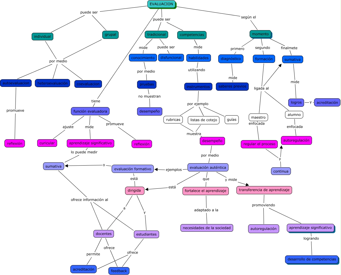 This Concept Map, created with IHMC CmapTools, has information related to: Luna Mishaan, alumno enfocada autoregulación, docentes ofrece feedback, grupal por medio heteroevaluación, EVALUACION puede ser individual, EVALUACION puede ser grupal, evaluación auténtica ejemplos evaluación formativo, individual por medio autoevaluacion, formación ligada al maestro, evaluación formativo está dirigida, formación ligada al alumno, evaluación auténtica y mide transferencia de aprendizaje, tradicional puede ser disfuncional, dirigida a docentes, sumativa ofrece información al estudiantes, maestro enfocada regular el proceso, momento segundo formación, formación ligada al sumativa, estudiantes ofrece acreditación, estudiantes ofrece feedback, conocimiento por medio pruebas