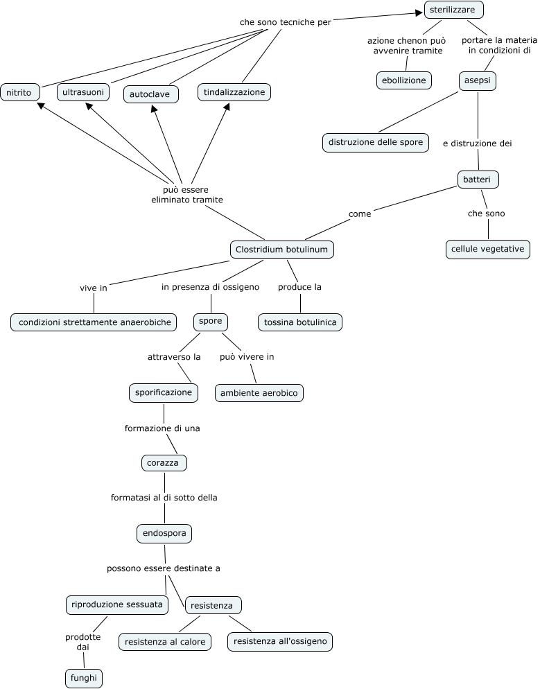 Questa Cmap, creata con IHMC CmapTools, contiene informazioni relative a: sterilizzazione 2 amicucci staffolani ferretti migliozzi, asepsi e distruzione dei batteri, sporificazione formazione di una corazza, resistenza resistenza all'ossigeno, ultrasuoni che sono tecniche per sterilizzare, Clostridium botulinum può essere eliminato tramite autoclave, batteri che sono cellule vegetative, sterilizzare azione chenon può avvenire tramite ebollizione, sterilizzare portare la materia in condizioni di asepsi, Clostridium botulinum in presenza di ossigeno spore, endospora possono essere destinate a riproduzione sessuata, resistenza resistenza al calore, riproduzione sessuata prodotte dai funghi, batteri come Clostridium botulinum, nitrito che sono tecniche per sterilizzare, Clostridium botulinum può essere eliminato tramite nitrito, spore può vivere in ambiente aerobico, corazza formatasi al di sotto della endospora, asepsi distruzione delle spore, autoclave che sono tecniche per sterilizzare, Clostridium botulinum vive in condizioni strettamente anaerobiche