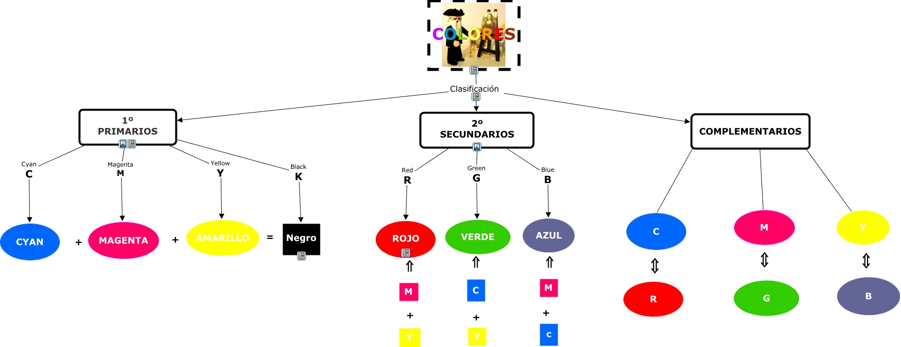Este Cmap, tiene información relacionada con: Actividad Mapa conceptual, 1º PRIMARIOS Magenta M MAGENTA, COLORES Clasificación 2º SECUNDARIOS, COLORES Clasificación 1º PRIMARIOS, 1º PRIMARIOS Black K Negro, COLORES Clasificación COMPLEMENTARIOS, 1º PRIMARIOS Cyan C CYAN, COMPLEMENTARIOS ???? Y, 2º SECUNDARIOS Blue B AZUL, COMPLEMENTARIOS ???? M, 2º SECUNDARIOS Red R ROJO, 2º SECUNDARIOS Green G VERDE, 1º PRIMARIOS Yellow Y AMARILLO, COMPLEMENTARIOS ???? C