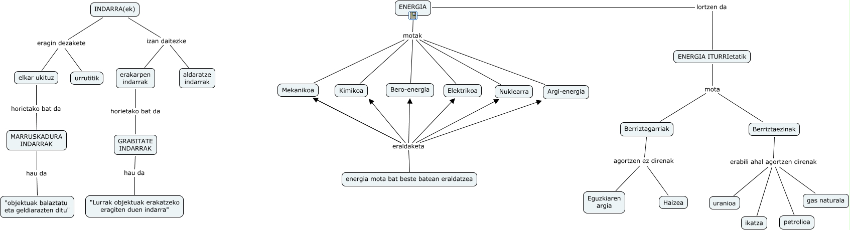 Este Cmap, tiene información relacionada con: Indarrak eta Energia, Mekanikoa eraldaketa energia mota bat beste batean eraldatzea, erakarpen indarrak horietako bat da GRABITATE INDARRAK, Berriztagarriak agortzen ez direnak Eguzkiaren argia, Berriztaezinak erabili ahal agortzen direnak uranioa, INDARRA(ek) eragin dezakete urrutitik, ENERGIA motak Bero-energia, GRABITATE INDARRAK hau da "Lurrak objektuak erakatzeko eragiten duen indarra", Berriztaezinak erabili ahal agortzen direnak ikatza, MARRUSKADURA INDARRAK hau da "objektuak balaztatu eta geldiarazten ditu", ENERGIA motak Nuklearra, Berriztaezinak erabili ahal agortzen direnak petrolioa, ENERGIA motak Mekanikoa, Mekanikoa eraldaketa Kimikoa, Mekanikoa eraldaketa Nuklearra, ENERGIA lortzen da ENERGIA ITURRIetatik, INDARRA(ek) eragin dezakete elkar ukituz, Berriztagarriak agortzen ez direnak Haizea, ENERGIA ITURRIetatik mota Berriztaezinak, ENERGIA motak Elektrikoa, ENERGIA motak Kimikoa