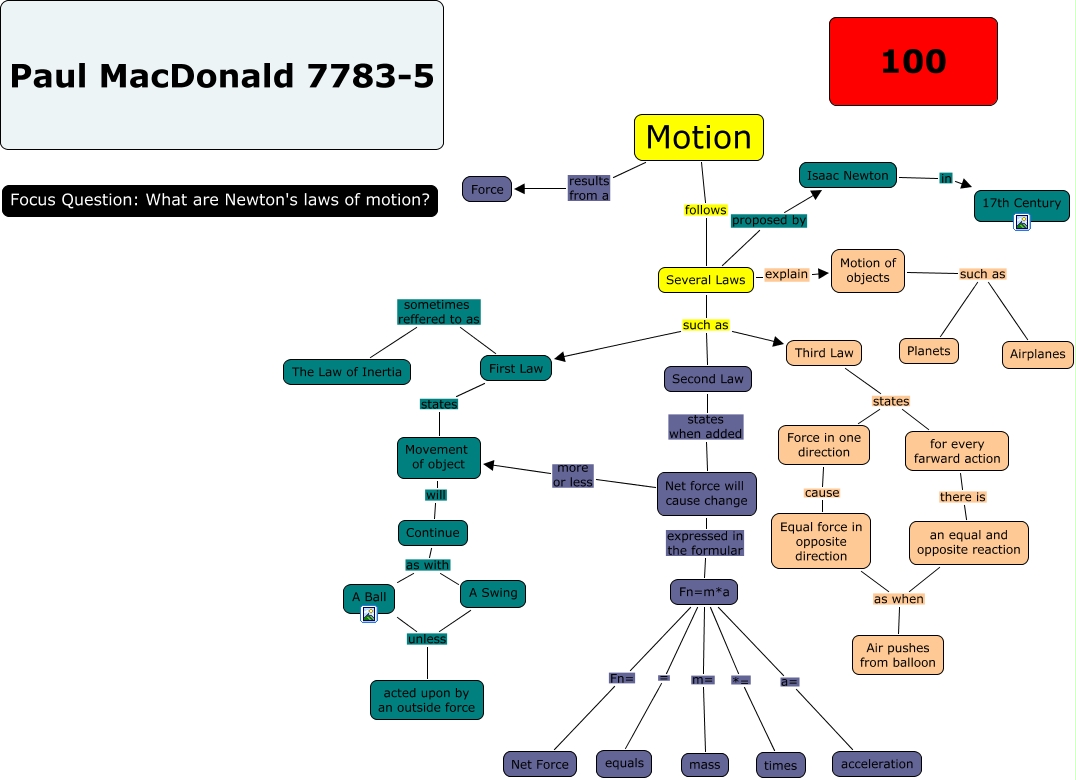 This Concept Map, created with IHMC CmapTools, has information related to: paul macdonald 7783-5, First Law states Movement of object, Fn=m*a m= mass, Motion of objects such as Planets, Fn=m*a = equals, Force in one direction cause Equal force in opposite direction, Motion follows Several Laws, Fn=m*a a= acceleration, Fn=m*a *= times, Second Law states when added Net force will cause change, First Law sometimes reffered to as The Law of Inertia, Fn=m*a Fn= Net Force, Motion of objects such as Airplanes, Third Law states Force in one direction, Several Laws proposed by Isaac Newton, Third Law states for every farward action, Continue as with A Ball, Net force will cause change expressed in the formular Fn=m*a, Several Laws such as First Law, Several Laws explain Motion of objects, Movement of object will Continue