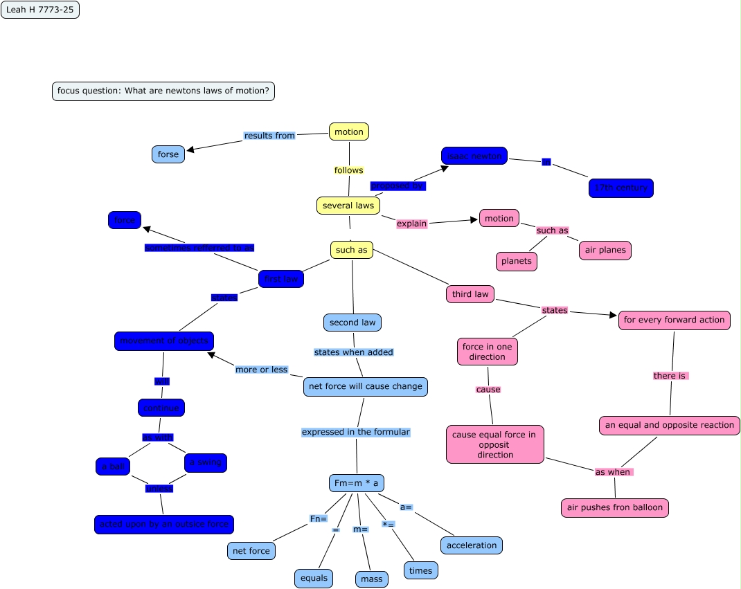 This Concept Map, created with IHMC CmapTools, has information related to: Leah H 7773-25, a ball unless acted upon by an outsice force, movement of objects will continue, an equal and opposite reaction as when air pushes fron balloon, motion results from forse, Fm=m * a Fn= net force, second law states when added net force will cause change, first law sometimes refferred to as force, Fm=m * a = equals, a swing unless acted upon by an outsice force, motion such as planets, continue as with a ball, such as first law, cause equal force in opposit direction as when air pushes fron balloon, motion follows several laws, several laws such as, for every forward action there is an equal and opposite reaction, motion such as air planes, several laws third law, Fm=m * a *= times, net force will cause change more or less movement of objects