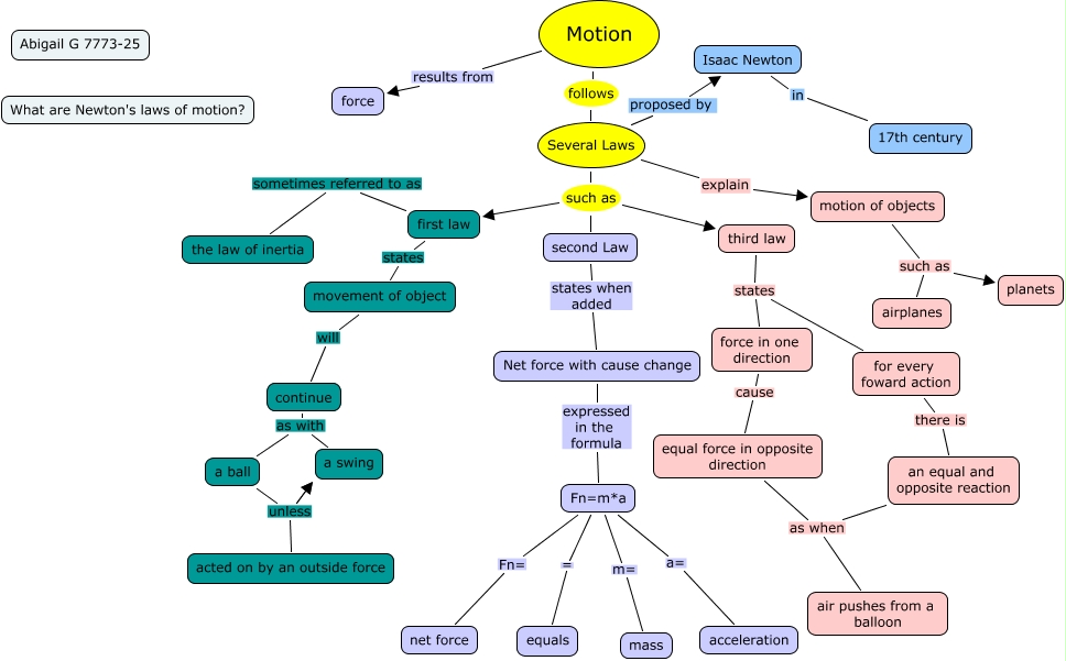 This Concept Map, created with IHMC CmapTools, has information related to: Abigail G 7773-25, Fn=m*a Fn= net force, second Law states when added Net force with cause change, Motion follows Several Laws, first law sometimes referred to as the law of inertia, Several Laws such as first law, Several Laws such as second Law, force in one direction cause equal force in opposite direction, Net force with cause change expressed in the formula Fn=m*a, first law states movement of object, motion of objects such as planets, Fn=m*a m= mass, equal force in opposite direction as when air pushes from a balloon, continue as with a ball, Motion results from force, an equal and opposite reaction as when air pushes from a balloon, third law states for every foward action, a ball unless a swing, Several Laws explain motion of objects, Fn=m*a a= acceleration, Fn=m*a = equals