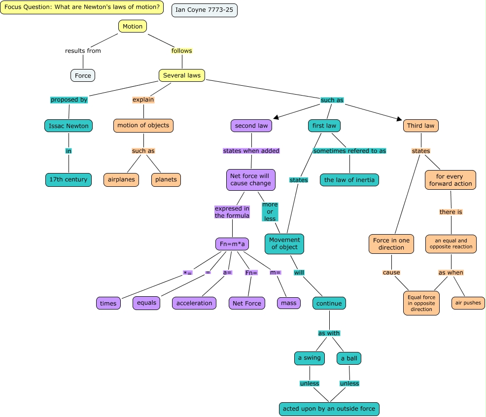 This Concept Map, created with IHMC CmapTools, has information related to: Ian C. 7773-25, Net force will cause change more or less Movement of object, Several laws such as second law, motion of objects such as airplanes, Several laws explain motion of objects, Issac Newton in 17th century, Movement of object will continue, Several laws such as Third law, Fn=m*a a= acceleration, Fn=m*a = equals, first law sometimes refered to as the law of inertia, Third law states for every forward action, Fn=m*a m= mass, first law states Movement of object, an equal and opposite reaction as when Equal force in opposite direction, an equal and opposite reaction as when air pushes, motion of objects such as planets, Third law states Force in one direction, Force in one direction cause Equal force in opposite direction, continue as with a swing, Several laws such as first law