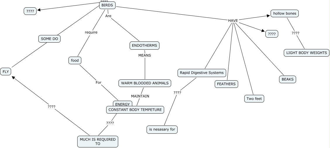 This Concept Map, created with IHMC CmapTools, has information related to: 1 26 12, Rapid Digestive Systems ???? is nesasary for, BIRDS ???? ????, BIRDS HAVE hollow bones, ENDOTHERMS MEANS WARM BLOODED ANIMALS, BIRDS HAVE ????, MUCH IS REQUIRED TO ???? FLY, BIRDS HAVE FEATHERS, BIRDS HAVE BEAKS, BIRDS ???? FLY, hollow bones ???? LIGHT BODY WEIGHTS, ENERGY ???? MUCH IS REQUIRED TO, BIRDS require food, BIRDS HAVE Two feet, WARM BLOODED ANIMALS MAINTAIN CONSTANT BODY TEMPETURE, food For ENERGY, BIRDS Are ENDOTHERMS, BIRDS HAVE Rapid Digestive Systems