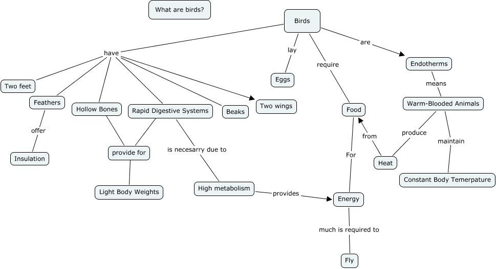 This Concept Map, created with IHMC CmapTools, has information related to: 2012-01-26-JessieG-7783-6, Feathers offer Insulation, Warm-Blooded Animals maintain Constant Body Temerpature, Rapid Digestive Systems is necesarry due to High metabolism, provide for ???? Light Body Weights, Birds have Beaks, Endotherms means Warm-Blooded Animals, Birds have Two wings, Warm-Blooded Animals produce Heat, Food For Energy, Birds require Food, Energy much is required to Fly, High metabolism provides Energy, Birds have Rapid Digestive Systems, Birds have Hollow Bones, Birds lay Eggs, Birds are Endotherms, Hollow Bones ???? provide for, Heat from Food, Rapid Digestive Systems ???? provide for, Birds have Feathers