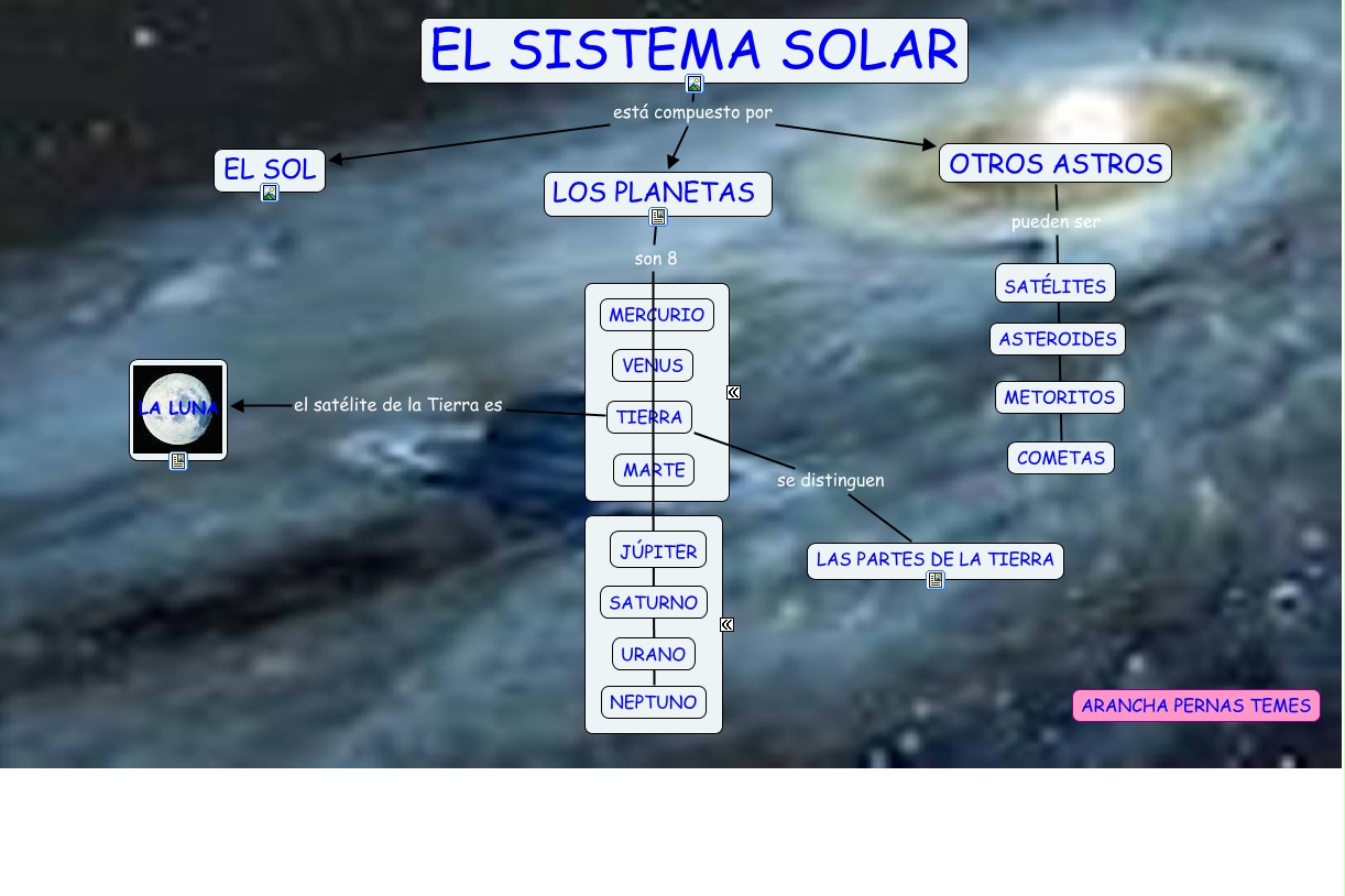 Este Cmap, tiene información relacionada con: EL SISTEMA SOLAR, EL SISTEMA SOLAR está compuesto por LOS PLANETAS, OTROS ASTROS pueden ser COMETAS, EL SISTEMA SOLAR está compuesto por EL SOL, TIERRA el satélite de la Tierra es LA LUNA, TIERRA se distinguen LAS PARTES DE LA TIERRA, EL SISTEMA SOLAR está compuesto por OTROS ASTROS