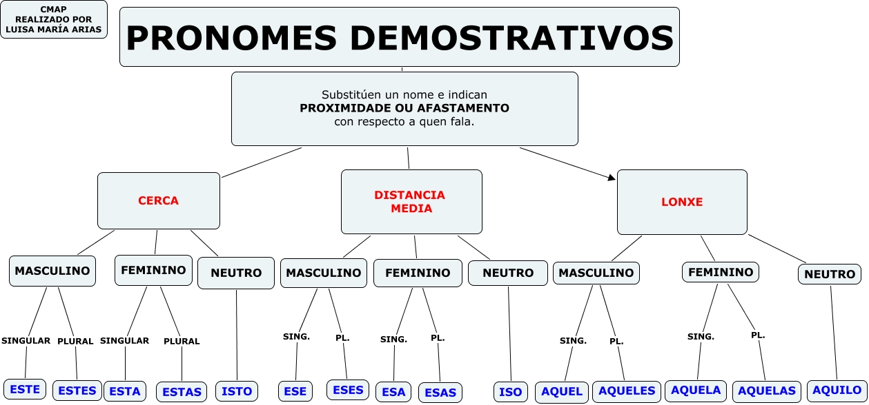 Este Cmap, tiene información relacionada con: PRONOMES DEMOSTRATIVOS, CERCA NEUTRO, MASCULINO SING. AQUEL, NEUTRO ISTO, MASCULINO PL. ESES, DISTANCIA MEDIA NEUTRO, CERCA FEMININO, PRONOMES DEMOSTRATIVOS Substitúen un nome e indican PROXIMIDADE OU AFASTAMENTO con respecto a quen fala., FEMININO PL. AQUELAS, NEUTRO AQUILO, NEUTRO ISO, LONXE MASCULINO, LONXE FEMININO, MASCULINO SINGULAR ESTE, DISTANCIA MEDIA MASCULINO, DISTANCIA MEDIA FEMININO, FEMININO SING. AQUELA, MASCULINO SING. ESE, FEMININO PL. ESAS, MASCULINO PLURAL ESTES, FEMININO SINGULAR ESTA