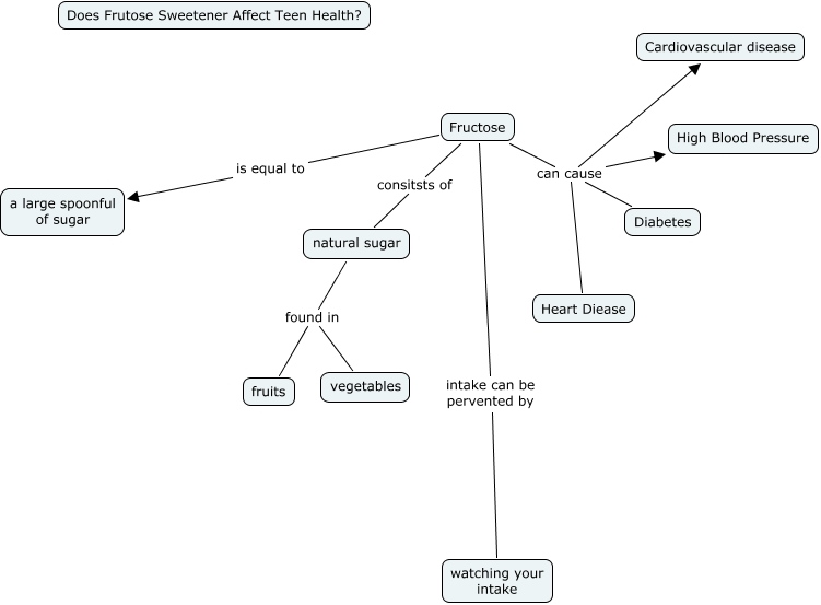 This Concept Map, created with IHMC CmapTools, has information related to: 7783-5 sugar map, Fructose is equal to a large spoonful of sugar, Fructose can cause High Blood Pressure, natural sugar found in fruits, Fructose consitsts of natural sugar, Fructose intake can be pervented by watching your intake, Fructose can cause Diabetes, Fructose can cause Cardiovascular disease, natural sugar found in vegetables, Fructose can cause Heart Diease
