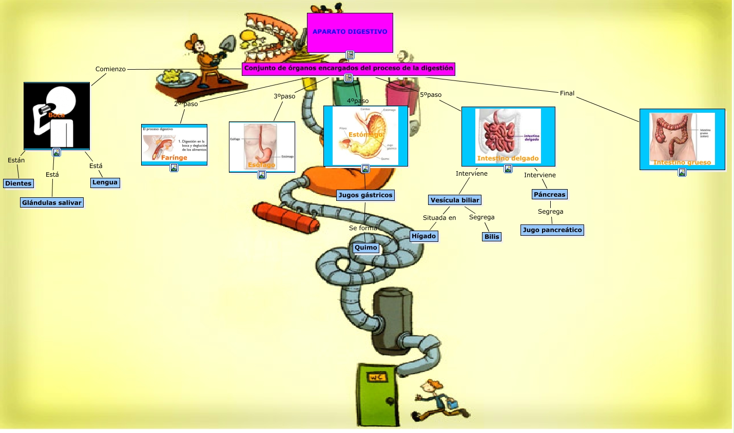 Este Cmap, tiene información relacionada con: Izaskun Garmendia Jorge, Conjunto de órganos encargados del proceso de la digestión Comienzo Boca, Páncreas Segrega Jugo pancreático, Intestino delgado Interviene Vesícula biliar, Conjunto de órganos encargados del proceso de la digestión 4ºpaso Estómago, Conjunto de órganos encargados del proceso de la digestión Final Intestino grueso, Boca Está Glándulas salivar, Vesícula biliar Situada en Hígado, Conjunto de órganos encargados del proceso de la digestión 5ºpaso Intestino delgado, Boca Están Dientes, APARATO DIGESTIVO ???? Conjunto de órganos encargados del proceso de la digestión, Jugos gástricos Se forma Quimo, Intestino delgado Interviene Páncreas, Vesícula biliar Segrega Bilis, Boca Está Lengua, Estómago ???? Jugos gástricos, Conjunto de órganos encargados del proceso de la digestión 2º paso Farínge, Conjunto de órganos encargados del proceso de la digestión 3ºpaso Esófago