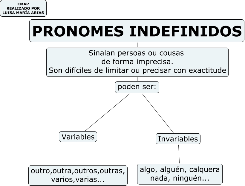 Este Cmap, tiene información relacionada con: pronomes indefinidos, poden ser: Invariables, PRONOMES INDEFINIDOS Sinalan persoas ou cousas de forma imprecisa. Son difíciles de limitar ou precisar con exactitude, Sinalan persoas ou cousas de forma imprecisa. Son difíciles de limitar ou precisar con exactitude poden ser:, poden ser: Variables, Variables outro,outra,outros,outras, varios,varias..., Invariables algo, alguén, calquera nada, ninguén...