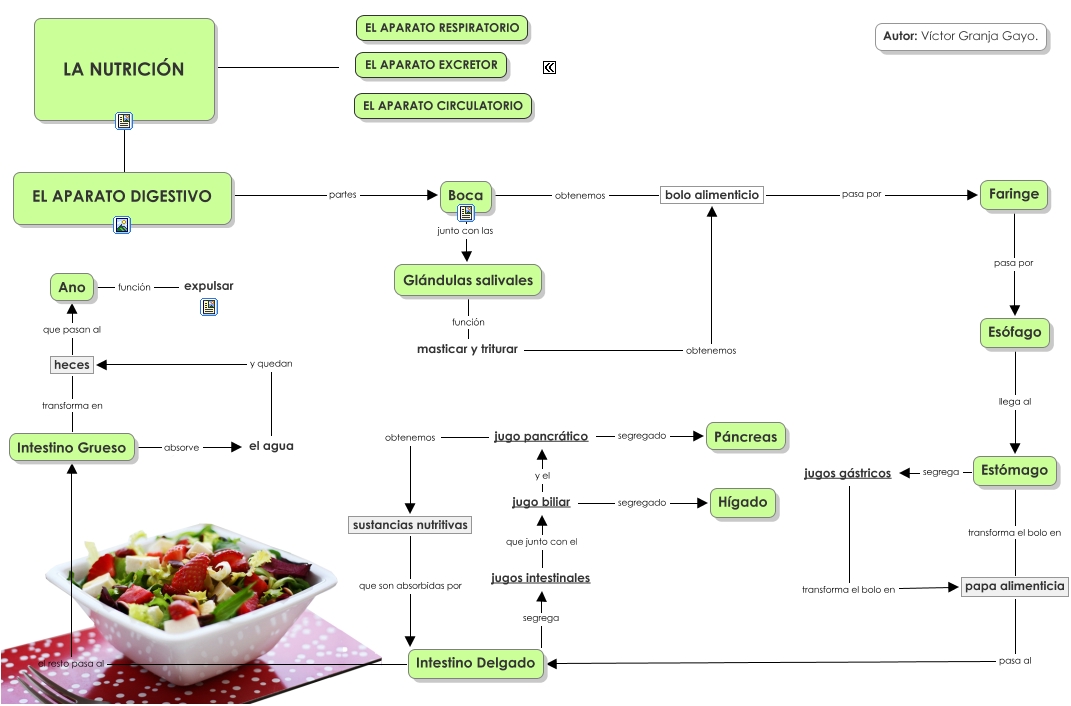 Este Cmap, tiene información relacionada con: aparato digestivo, jugo pancrático obtenemos sustancias nutritivas, Boca obtenemos bolo alimenticio, papa alimenticia pasa al Intestino Delgado, LA NUTRICIÓN ???? también forman parte de ella, Faringe pasa por Esófago, Esófago llega al Estómago, sustancias nutritivas que son absorbidas por Intestino Delgado, Boca junto con las Glándulas salivales, masticar y triturar obtenemos bolo alimenticio, bolo alimenticio pasa por Faringe, Intestino Grueso transforma en heces, Intestino Grueso absorve el agua, Ano función expulsar, Intestino Delgado segrega jugos intestinales, Glándulas salivales función masticar y triturar, jugo biliar y el jugo pancrático, jugo biliar segregado Hígado, jugos intestinales que junto con el jugo biliar, Intestino Delgado el resto pasa al Intestino Grueso, el agua y quedan heces