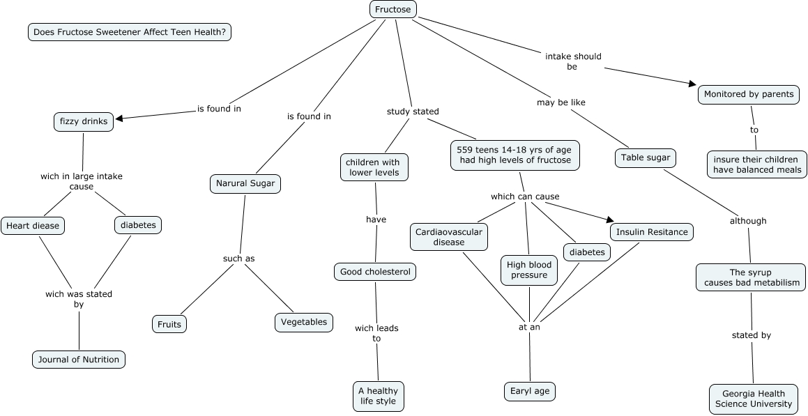 This Concept Map, created with IHMC CmapTools, has information related to: 2012-1-31 Lombar M 7783-5 FRUCTOSE, Fructose intake should be Monitored by parents, 559 teens 14-18 yrs of age had high levels of fructose which can cause Cardiaovascular disease, diabetes wich was stated by Journal of Nutrition, Fructose study stated 559 teens 14-18 yrs of age had high levels of fructose, 559 teens 14-18 yrs of age had high levels of fructose which can cause diabetes, 559 teens 14-18 yrs of age had high levels of fructose which can cause High blood pressure, Table sugar although The syrup causes bad metabilism, Fructose is found in Narural Sugar, High blood pressure at an Earyl age, Insulin Resitance at an Earyl age, The syrup causes bad metabilism stated by Georgia Health Science University, fizzy drinks wich in large intake cause diabetes, fizzy drinks wich in large intake cause Heart diease, Monitored by parents to insure their children have balanced meals, Cardiaovascular disease at an Earyl age, Fructose is found in fizzy drinks, diabetes at an Earyl age, Narural Sugar such as Vegetables, Good cholesterol wich leads to A healthy life style, Fructose study stated children with lower levels