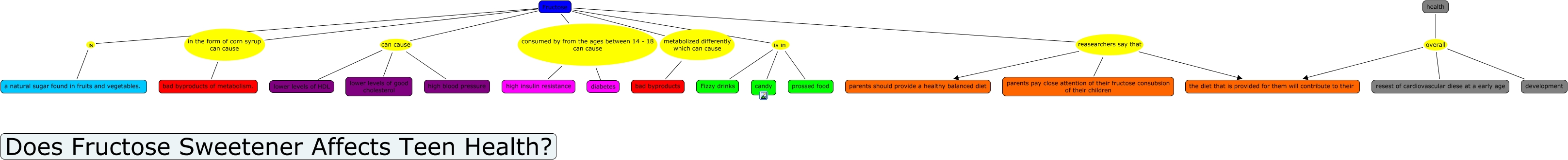This Concept Map, created with IHMC CmapTools, has information related to: 2012-31-1 alden haverly, Fructose reasearchers say that parents should provide a healthy balanced diet, Fructose metabolized differently which can cause bad byproducts, Fructose is in candy, Fructose in the form of corn syrup can cause bad byproducts of metabolism., health overall the diet that is provided for them will contribute to their, Fructose consumed by from the ages between 14 - 18 can cause diabetes, health overall development, Fructose is in Fizzy drinks, Fructose can cause lower levels of HDL, Fructose reasearchers say that parents pay close attention of their fructose consubsion of their children, health overall resest of cardiovascular diese at a early age, Fructose is in prossed food, Fructose can cause high blood pressure, Fructose can cause lower levels of good cholesterol, Fructose consumed by from the ages between 14 - 18 can cause high insulin resistance, Fructose reasearchers say that the diet that is provided for them will contribute to their, Fructose is a natural sugar found in fruits and vegetables.