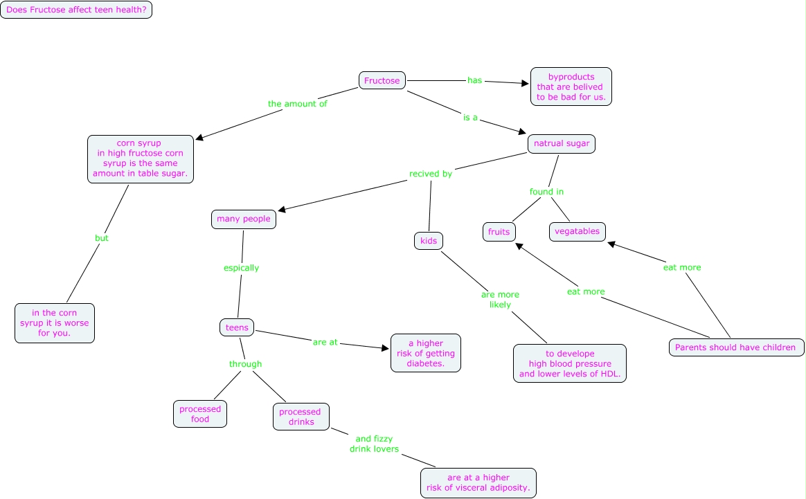 This Concept Map, created with IHMC CmapTools, has information related to: 2012-01-31 grace adamson 77835, natrual sugar recived by kids, Parents should have children eat more vegatables, teens are at a higher risk of getting diabetes., teens through processed food, processed drinks and fizzy drink lovers are at a higher risk of visceral adiposity., teens through processed drinks, many people espically teens, corn syrup in high fructose corn syrup is the same amount in table sugar. but in the corn syrup it is worse for you., natrual sugar found in fruits, Fructose has byproducts that are belived to be bad for us., Fructose is a natrual sugar, Parents should have children eat more fruits, natrual sugar recived by many people, kids are more likely to develope high blood pressure and lower levels of HDL., natrual sugar found in vegatables, Fructose the amount of corn syrup in high fructose corn syrup is the same amount in table sugar.
