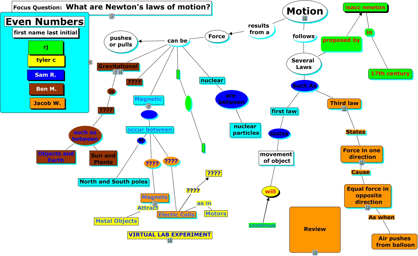 This Concept Map, created with IHMC CmapTools, has information related to: even numbered students 7783-5, Magnets Attract Metal Objects, Equal force in opposite direction As when Air pushes from balloon, Electic Coils as in Motors, occur between ???? Magnets, Third law States Force in one direction, can be pushes or pulls, Motion results from a Force, Electic Coils ???? ????, occur between ???? Electic Coils, can be Magnetic, Force in one direction Cause Equal force in opposite direction, occur between M North and South poles, Gravitational is ????, Magnetic ???? occur between, can be nuclear, nuclear are between nuclear particles, Force can be Magnetic, Several Laws Such As Third law, Force can be Gravitational, Force can be pushes or pulls