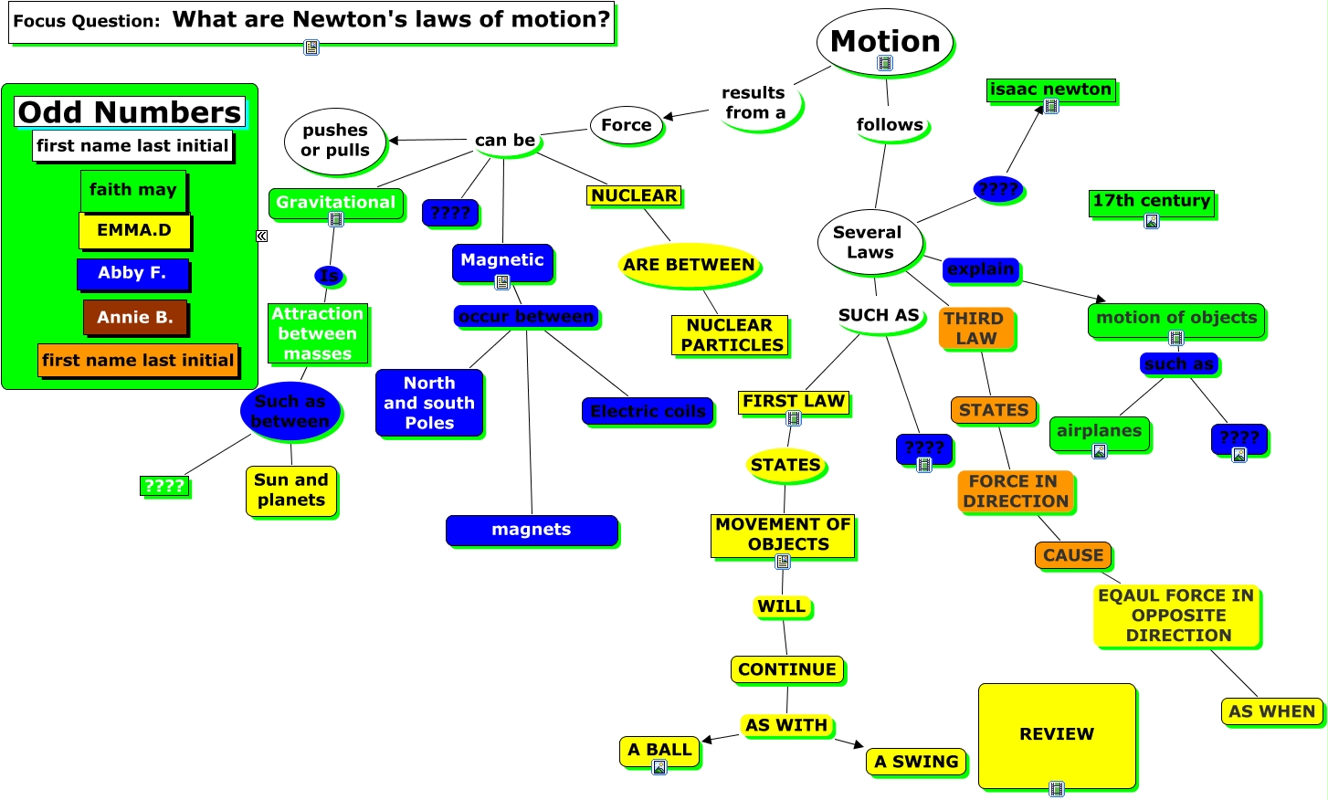This Concept Map, created with IHMC CmapTools, has information related to: odd numbered students 7783-5, STATES FORCE IN DIRECTION CAUSE, motion of objects such as ????, Several Laws SUCH AS FIRST LAW, Force can be NUCLEAR, Motion results from a Force, Magnetic occur between magnets, MOVEMENT OF OBJECTS WILL CONTINUE, Attraction between masses Such as between Sun and planets, Magnetic occur between Electric coils, Force can be ????, Several Laws SUCH AS ????, FIRST LAW STATES MOVEMENT OF OBJECTS, Several Laws ???? isaac newton, Force can be Gravitational, Force can be pushes or pulls, CAUSE EQAUL FORCE IN OPPOSITE DIRECTION AS WHEN, Magnetic occur between North and south Poles, Several Laws THIRD LAW STATES, CONTINUE AS WITH A SWING, motion of objects such as airplanes