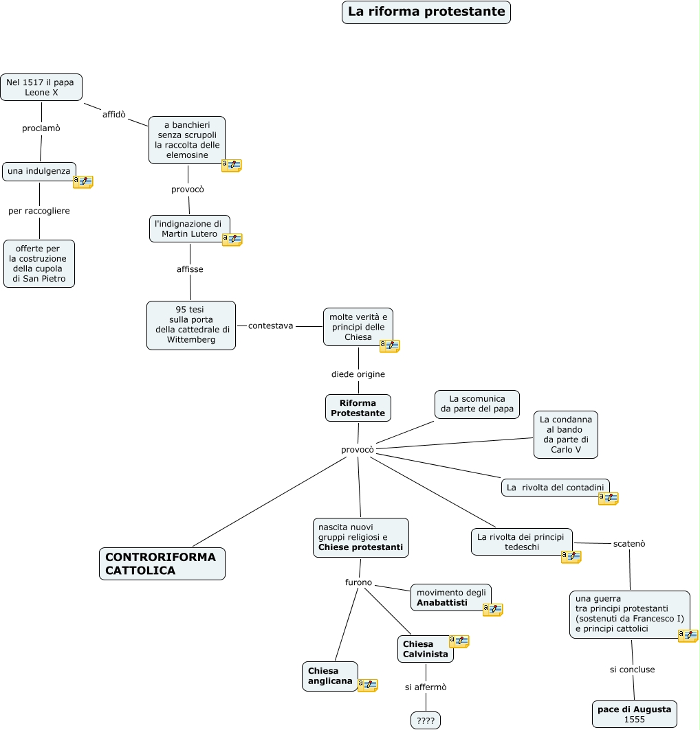 Questa Cmap, creata con IHMC CmapTools, contiene informazioni relative a: 8) La Riforma protestante (AA), nascita nuovi gruppi religiosi e Chiese protestanti furono Chiesa Calvinista, Riforma Protestante provocò La condanna al bando da parte di Carlo V, Chiesa Calvinista si affermò ????, a banchieri senza scrupoli la raccolta delle elemosine provocò l'indignazione di Martin Lutero, Riforma Protestante provocò CONTRORIFORMA CATTOLICA, molte verità e principi delle Chiesa diede origine Riforma Protestante, Riforma Protestante provocò La scomunica da parte del papa, Riforma Protestante provocò La rivolta del contadini, 95 tesi sulla porta della cattedrale di Wittemberg contestava molte verità e principi delle Chiesa, Nel 1517 il papa Leone X affidò a banchieri senza scrupoli la raccolta delle elemosine, La rivolta dei principi tedeschi scatenò una guerra tra principi protestanti (sostenuti da Francesco I) e principi cattolici, una guerra tra principi protestanti (sostenuti da Francesco I) e principi cattolici si concluse pace di Augusta 1555, Riforma Protestante provocò nascita nuovi gruppi religiosi e Chiese protestanti, una indulgenza per raccogliere offerte per la costruzione della cupola di San Pietro, Riforma Protestante provocò La rivolta dei principi tedeschi, nascita nuovi gruppi religiosi e Chiese protestanti furono movimento degli Anabattisti, l'indignazione di Martin Lutero affisse 95 tesi sulla porta della cattedrale di Wittemberg, Nel 1517 il papa Leone X proclamò una indulgenza, nascita nuovi gruppi religiosi e Chiese protestanti furono Chiesa anglicana