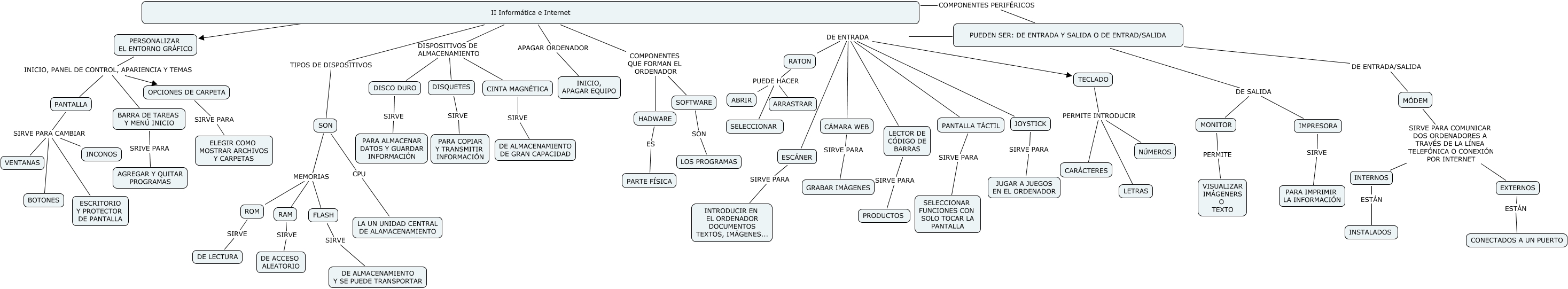 Este Cmap, tiene información relacionada con: INFORMATICA E INTERNET, II Informática e Internet COMPONENTES QUE FORMAN EL ORDENADOR HADWARE, PUEDEN SER: DE ENTRADA Y SALIDA O DE ENTRAD/SALIDA DE ENTRADA TECLADO, PANTALLA TÁCTIL SIRVE PARA SELECCIONAR FUNCIONES CON SOLO TOCAR LA PANTALLA, PUEDEN SER: DE ENTRADA Y SALIDA O DE ENTRAD/SALIDA DE ENTRADA CÁMARA WEB, MÓDEM SIRVE PARA COMUNICAR DOS ORDENADORES A TRAVÉS DE LA LÍNEA TELEFÓNICA O CONEXIÓN POR INTERNET EXTERNOS, SON MEMORIAS ROM, ESCÁNER SIRVE PARA INTRODUCIR EN EL ORDENADOR DOCUMENTOS TEXTOS, IMÁGENES..., OPCIONES DE CARPETA SIRVE PARA ELEGIR COMO MOSTRAR ARCHIVOS Y CARPETAS, TECLADO PERMITE INTRODUCIR NÚMEROS, II Informática e Internet DISPOSITIVOS DE ALMACENAMIENTO DISQUETES, DISQUETES SIRVE PARA COPIAR Y TRANSMITIR INFORMACIÓN, IMPRESORA SIRVE PARA IMPRIMIR LA INFORMACIÓN, PERSONALIZAR EL ENTORNO GRÁFICO INICIO, PANEL DE CONTROL, APARIENCIA Y TEMAS BARRA DE TAREAS Y MENÚ INICIO, RATON PUEDE HACER SELECCIONAR, RATON PUEDE HACER ABRIR, II Informática e Internet DISPOSITIVOS DE ALMACENAMIENTO DISCO DURO, JOYSTICK SIRVE PARA JUGAR A JUEGOS EN EL ORDENADOR, BARRA DE TAREAS Y MENÚ INICIO SRIVE PARA AGREGAR Y QUITAR PROGRAMAS, TECLADO PERMITE INTRODUCIR LETRAS, PERSONALIZAR EL ENTORNO GRÁFICO INICIO, PANEL DE CONTROL, APARIENCIA Y TEMAS OPCIONES DE CARPETA