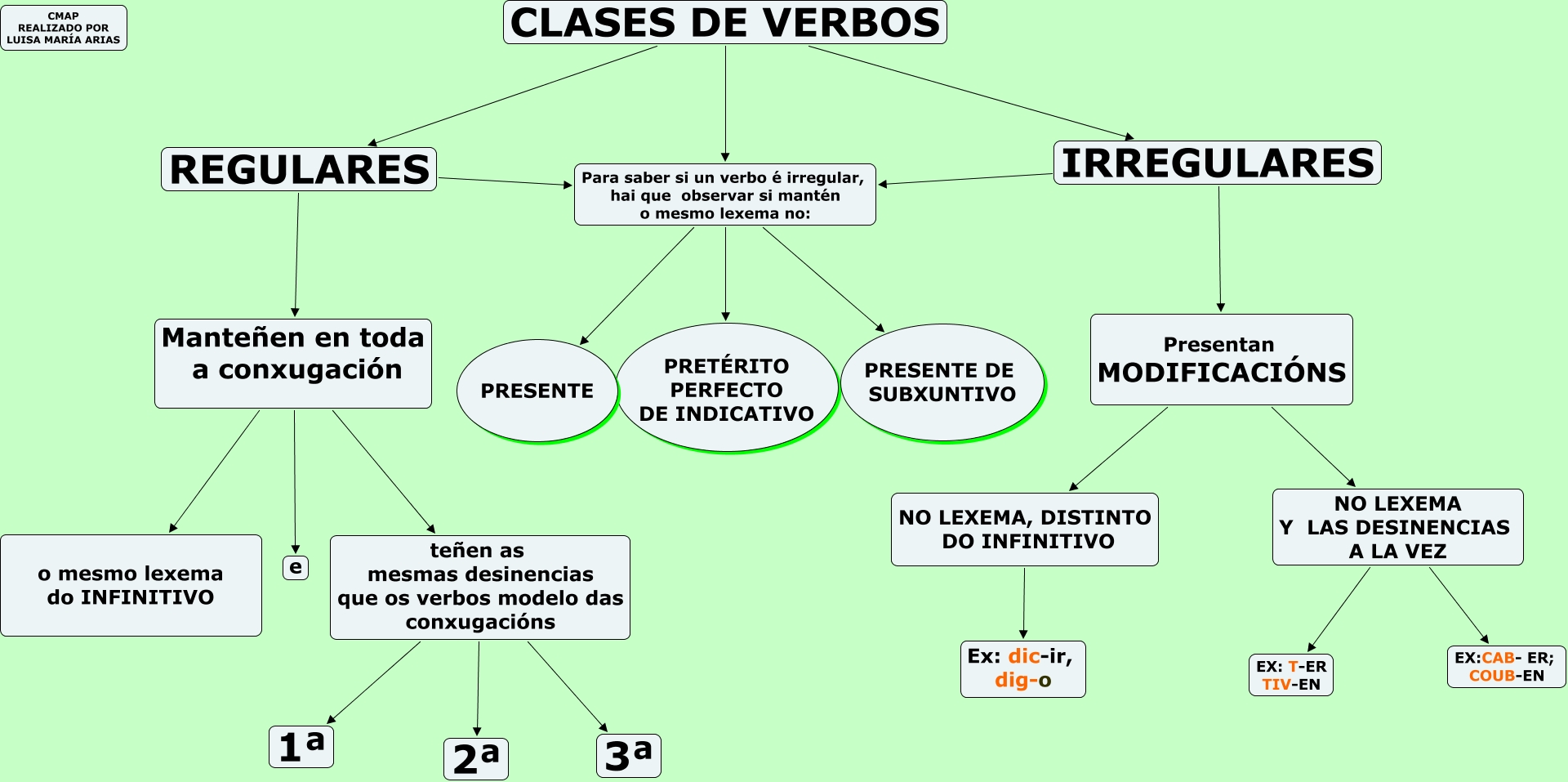 Este Cmap, tiene información relacionada con: CLASES DE VERBOS GALEGO, IRREGULARES Para saber si un verbo é irregular, hai que observar si mantén o mesmo lexema no:, NO LEXEMA Y LAS DESINENCIAS A LA VEZ EX:CAB- ER; COUB-EN, Manteñen en toda a conxugación teñen as mesmas desinencias que os verbos modelo das conxugacións, teñen as mesmas desinencias que os verbos modelo das conxugacións 2ª, REGULARES Para saber si un verbo é irregular, hai que observar si mantén o mesmo lexema no:, Para saber si un verbo é irregular, hai que observar si mantén o mesmo lexema no: PRETÉRITO PERFECTO DE INDICATIVO, Presentan MODIFICACIÓNS NO LEXEMA, DISTINTO DO INFINITIVO, CLASES DE VERBOS Para saber si un verbo é irregular, hai que observar si mantén o mesmo lexema no:, IRREGULARES Presentan MODIFICACIÓNS, teñen as mesmas desinencias que os verbos modelo das conxugacións 3ª, teñen as mesmas desinencias que os verbos modelo das conxugacións 1ª, NO LEXEMA, DISTINTO DO INFINITIVO Ex: dic-ir, dig-o, Para saber si un verbo é irregular, hai que observar si mantén o mesmo lexema no: PRESENTE DE SUBXUNTIVO, Manteñen en toda a conxugación o mesmo lexema do INFINITIVO, NO LEXEMA Y LAS DESINENCIAS A LA VEZ EX: T-ER TIV-EN, Presentan MODIFICACIÓNS NO LEXEMA Y LAS DESINENCIAS A LA VEZ, Manteñen en toda a conxugación e, CLASES DE VERBOS IRREGULARES, CLASES DE VERBOS REGULARES, Para saber si un verbo é irregular, hai que observar si mantén o mesmo lexema no: PRESENTE
