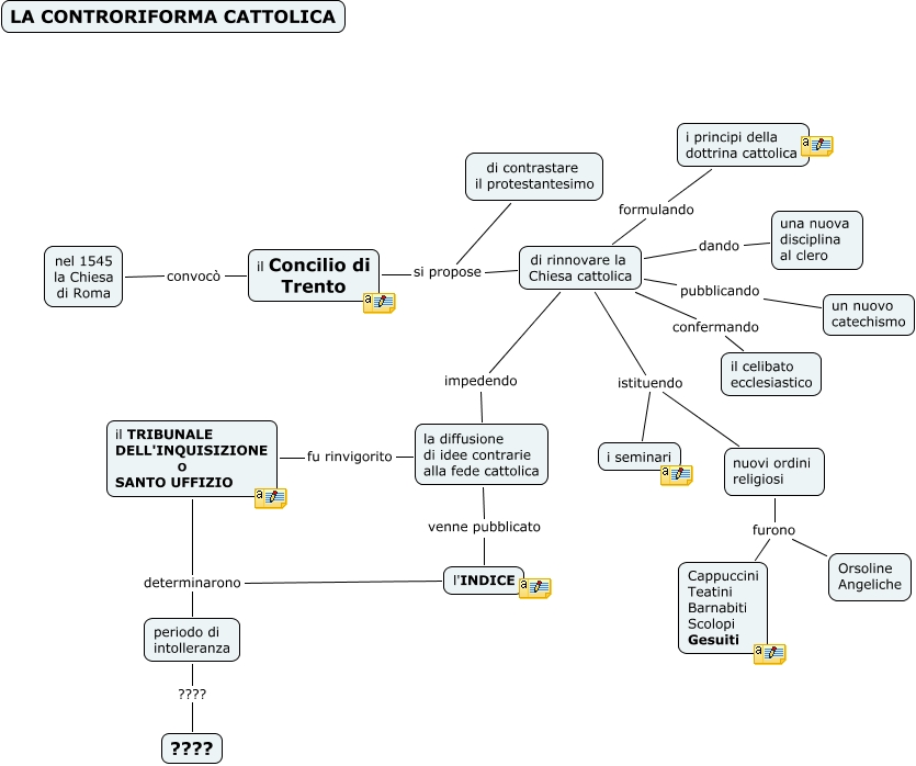 Questa Cmap, creata con IHMC CmapTools, contiene informazioni relative a: 9) La controriforma cattolica (AA), nel 1545 la Chiesa di Roma convocò il Concilio di Trento, il Concilio di Trento si propose di contrastare il protestantesimo, la diffusione di idee contrarie alla fede cattolica fu rinvigorito il TRIBUNALE DELL'INQUISIZIONE O SANTO UFFIZIO, periodo di intolleranza ???? ????, di rinnovare la Chiesa cattolica confermando il celibato ecclesiastico, il TRIBUNALE DELL'INQUISIZIONE O SANTO UFFIZIO determinarono l'INDICE, nuovi ordini religiosi furono Cappuccini Teatini Barnabiti Scolopi Gesuiti, di rinnovare la Chiesa cattolica istituendo nuovi ordini religiosi, di rinnovare la Chiesa cattolica istituendo i seminari, di rinnovare la Chiesa cattolica dando una nuova disciplina al clero, di rinnovare la Chiesa cattolica impedendo la diffusione di idee contrarie alla fede cattolica, il TRIBUNALE DELL'INQUISIZIONE O SANTO UFFIZIO determinarono periodo di intolleranza, il Concilio di Trento si propose di rinnovare la Chiesa cattolica, di rinnovare la Chiesa cattolica formulando i principi della dottrina cattolica, la diffusione di idee contrarie alla fede cattolica venne pubblicato l'INDICE, di rinnovare la Chiesa cattolica pubblicando un nuovo catechismo, nuovi ordini religiosi furono Orsoline Angeliche