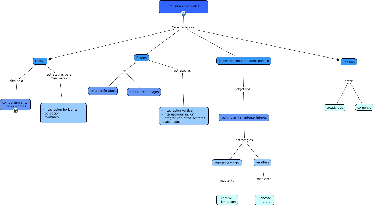 Este Cmap, tiene información relacionada con: delriogrela_caracteristicas industrias, Bienes de consumo semi-público objetivos estimular y mantener interés, estimular y mantener interés estrategias reselling, Riesgo estrategias para minimizarlo - integración horizontal - co-opción - formateo, Industrias Culturales Características Tensión, Costes de reproducción bajos, Costes estrategias - integración vertical - internacionalización - integrar con otros sectores relacionados, Costes de producción altos, Riesgo debido a comportamiento consumidores, reselling mediante - innovar - mejorar, Industrias Culturales Características Costes, Tensión entre comercio, Industrias Culturales Características Bienes de consumo semi-público, escasez artificial mediante - control - limitación, Tensión entre creatividad, Industrias Culturales Características Riesgo, estimular y mantener interés estrategias escasez artificial