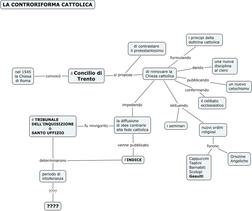 Questa Cmap, creata con IHMC CmapTools, contiene informazioni relative a: 9) La controriforma cattolica (classe II) GIANNINI E RIZZI, nel 1545 la Chiesa di Roma convocò il Concilio di Trento, il Concilio di Trento si propose di contrastare il protestantesimo, periodo di intolleranza ???? ????, la diffusione di idee contrarie alla fede cattolica fu rinvigorito il TRIBUNALE DELL'INQUISIZIONE O SANTO UFFIZIO, di rinnovare la Chiesa cattolica confermando il celibato ecclesiastico, il TRIBUNALE DELL'INQUISIZIONE O SANTO UFFIZIO determinarono l'INDICE, di rinnovare la Chiesa cattolica istituendo nuovi ordini religiosi, nuovi ordini religiosi furono Cappuccini Teatini Barnabiti Scolopi Gesuiti, di rinnovare la Chiesa cattolica dando una nuova disciplina al clero, di rinnovare la Chiesa cattolica istituendo i seminari, di rinnovare la Chiesa cattolica impedendo la diffusione di idee contrarie alla fede cattolica, il Concilio di Trento si propose di rinnovare la Chiesa cattolica, il TRIBUNALE DELL'INQUISIZIONE O SANTO UFFIZIO determinarono periodo di intolleranza, la diffusione di idee contrarie alla fede cattolica venne pubblicato l'INDICE, di rinnovare la Chiesa cattolica formulando i principi della dottrina cattolica, nuovi ordini religiosi furono Orsoline Angeliche, di rinnovare la Chiesa cattolica pubblicando un nuovo catechismo