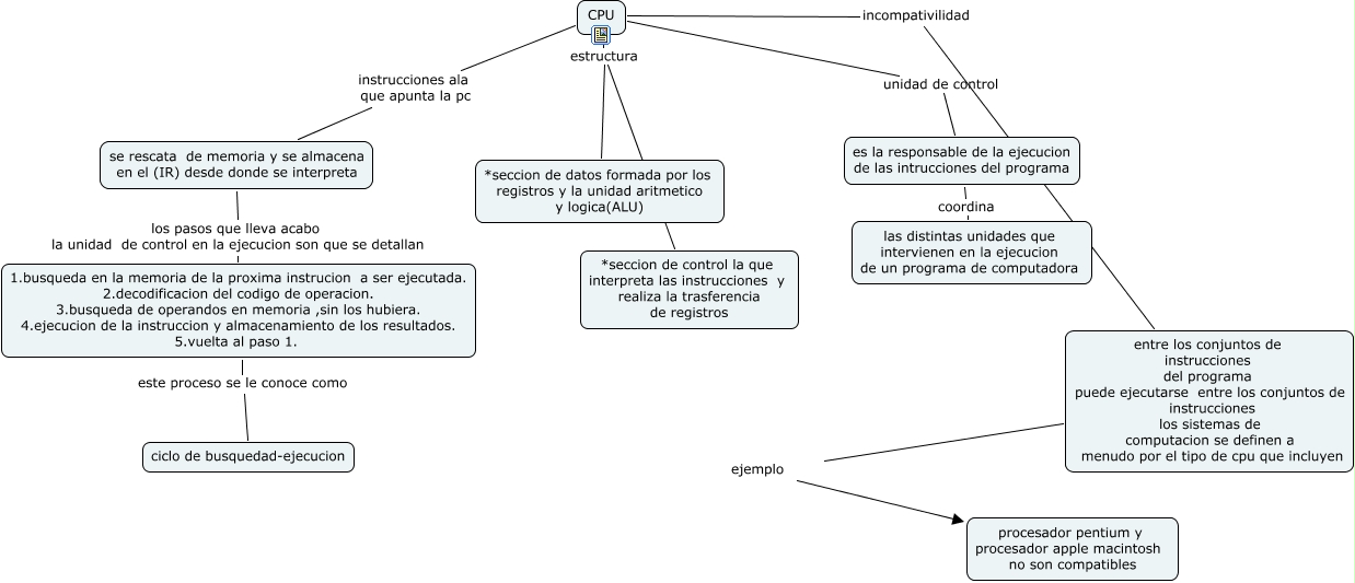 This Concept Map, created with IHMC CmapTools, has information related to: Mapa CPU Oscar, CPU unidad de control es la responsable de la ejecucion de las intrucciones del programa, CPU estructura *seccion de datos formada por los registros y la unidad aritmetico y logica(ALU), es la responsable de la ejecucion de las intrucciones del programa coordina las distintas unidades que intervienen en la ejecucion de un programa de computadora, 1.busqueda en la memoria de la proxima instrucion a ser ejecutada. 2.decodificacion del codigo de operacion. 3.busqueda de operandos en memoria ,sin los hubiera. 4.ejecucion de la instruccion y almacenamiento de los resultados. 5.vuelta al paso 1. este proceso se le conoce como ciclo de busquedad-ejecucion, CPU estructura *seccion de control la que interpreta las instrucciones y realiza la trasferencia de registros, entre los conjuntos de instrucciones del programa puede ejecutarse entre los conjuntos de instrucciones los sistemas de computacion se definen a menudo por el tipo de cpu que incluyen ejemplo procesador pentium y procesador apple macintosh no son compatibles, CPU instrucciones ala que apunta la pc se rescata de memoria y se almacena en el (IR) desde donde se interpreta, CPU incompativilidad entre los conjuntos de instrucciones del programa puede ejecutarse entre los conjuntos de instrucciones los sistemas de computacion se definen a menudo por el tipo de cpu que incluyen, se rescata de memoria y se almacena en el (IR) desde donde se interpreta los pasos que lleva acabo la unidad de control en la ejecucion son que se detallan 1.busqueda en la memoria de la proxima instrucion a ser ejecutada. 2.decodificacion del codigo de operacion. 3.busqueda de operandos en memoria ,sin los hubiera. 4.ejecucion de la instruccion y almacenamiento de los resultados. 5.vuelta al paso 1.