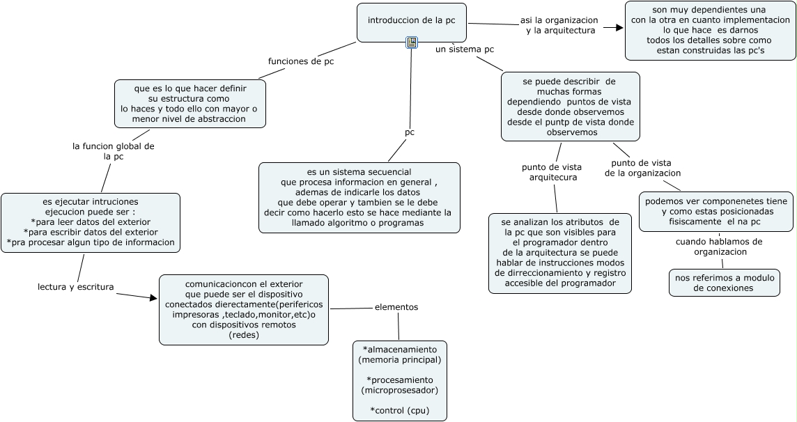 This Concept Map, created with IHMC CmapTools, has information related to: introduccion ala pc oscar, comunicacioncon el exterior que puede ser el dispositivo conectados dierectamente(perifericos impresoras ,teclado,monitor,etc)o con dispositivos remotos (redes) elementos *almacenamiento (memoria principal) *procesamiento (microprosesador) *control (cpu), se puede describir de muchas formas dependiendo puntos de vista desde donde observemos desde el puntp de vista donde observemos punto de vista arquitecura se analizan los atributos de la pc que son visibles para el programador dentro de la arquitectura se puede hablar de instrucciones modos de dirreccionamiento y registro accesible del programador, podemos ver componenetes tiene y como estas posicionadas fisiscamente el na pc cuando hablamos de organizacion nos referimos a modulo de conexiones, que es lo que hacer definir su estructura como lo haces y todo ello con mayor o menor nivel de abstraccion la funcion global de la pc es ejecutar intruciones ejecucion puede ser : *para leer datos del exterior *para escribir datos del exterior *pra procesar algun tipo de informacion, se puede describir de muchas formas dependiendo puntos de vista desde donde observemos desde el puntp de vista donde observemos punto de vista de la organizacion podemos ver componenetes tiene y como estas posicionadas fisiscamente el na pc, es ejecutar intruciones ejecucion puede ser : *para leer datos del exterior *para escribir datos del exterior *pra procesar algun tipo de informacion lectura y escritura comunicacioncon el exterior que puede ser el dispositivo conectados dierectamente(perifericos impresoras ,teclado,monitor,etc)o con dispositivos remotos (redes), introduccion de la pc pc es un sistema secuencial que procesa informacion en general , ademas de indicarle los datos que debe operar y tambien se le debe decir como hacerlo esto se hace mediante la llamado algoritmo o programas, introduccion de la pc asi la organizacion y la arquitectura son muy dependientes una con la otra en cuanto implementacion lo que hace es darnos todos los detalles sobre como estan construidas las pc's, introduccion de la pc funciones de pc que es lo que hacer definir su estructura como lo haces y todo ello con mayor o menor nivel de abstraccion, introduccion de la pc un sistema pc se puede describir de muchas formas dependiendo puntos de vista desde donde observemos desde el puntp de vista donde observemos