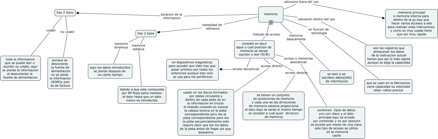 This Concept Map, created with IHMC CmapTools, has information related to: mapa de memoria 2 oscar, consiste en decir aque o cual posicion de memoria se decea escribir o leer (R/W) acceso secuencial en dispositivos magneticos para acceder aun dato hay que pasar primero por todos los anteriores aunque esto solo se usa para los perifericos, consiste en decir aque o cual posicion de memoria se decea escribir o leer (R/W) acceso o memorias asociativas contienen tipos de datos uno con clave y el dato principal aqui se accede por contenido y no por posicion se accede por medio de una clave este tipo de acceso se utiliza en la memoria cache, consiste en decir aque o cual posicion de memoria se decea escribir o leer (R/W) acceso aletorio se tienen un conjunto de posisciones de memoria y cada una de las dirreciones de memoria estanos proporciona el dato.Aqui se tarda el mismo tiempo en acceder a cual quier dirrecion de memoria, memoria metodo de acceso consiste en decir aque o cual posicion de memoria se decea escribir o leer (R/W), memoria memoria basicamente se leen o se escriben datos(bits) de informacion, memoria ubicacion fuera del cpu memoria principal o memoria interna para dentro de la pc,hay que hacer varios accesos a ella para realizan unas instruciones y como es muy usada tiene que ser muy rapida, memoria ubicacion dentro del cpu son los registros que almacenan los datos de la instruccion actual tienen que ser lo mas rapido aunque se baja la capacidad, memoria nesesidad de refrescos hay 2 tipos, consiste en decir aque o cual posicion de memoria se decea escribir o leer (R/W) acceso directo usado en los discos formados por pistas circulares y dentro de cada pista de en la informacion en trozos el metodo consiste en colocar la cabeza lectora en la pista coorespondiente pero lee la pista correspondiente pero lee la pista secuencialemente esto require decir que lee los datos de la pista antes de llegar alo que deseamos, memoria en funcion de tecnologia que se usan en la fabricacion varia capacidad su velocidad altas =altos precios, hay 2 tipos memoria dinamica aqui los datos introducidos se pierde despues de un cierto tiempo, hay 2 tipos no volatil aunque se desconecte la fuente de alimentacion no se piede la informacion (ROM)y solo es de lectura, hay 2 tipos volatil toda la informacion que se puede leer o escribir es volatil, aqui se pierde la informacion al desconectar la fuente de alimentacion, hay 2 tipos memoria estatica debido a que esta compuesta por flif flops estos mantien el dato hasta que un dato nuevo es introducido, memoria duracion de la informacion hay 2 tipos